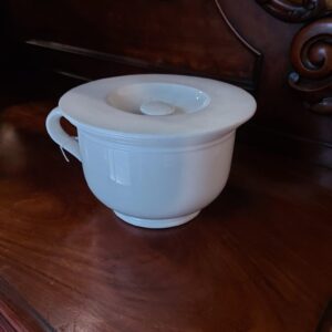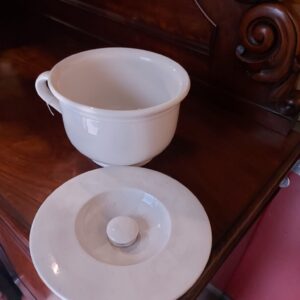 - Kamerpot ook wel po of pispot genoemd. Materiaal: aardewerk Leeftijd: begin 1900 Herkomst: Nederland Afmetingen: Hoogte: 15 cm. Doorsnede: 22 cm.
