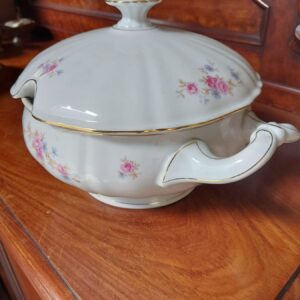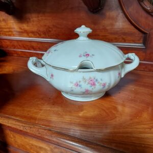 - Ouderwetse soepterrine. Materiaal: porselein, niet gemerkt Leeftijd: ca. 1930 Herkomst: Duitsland Afmetingen: Hoogte: 22 cm. Doorsnede: 25 cm.