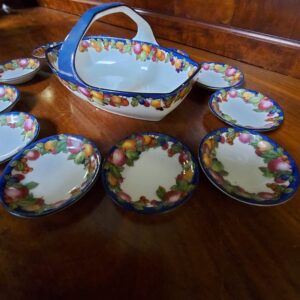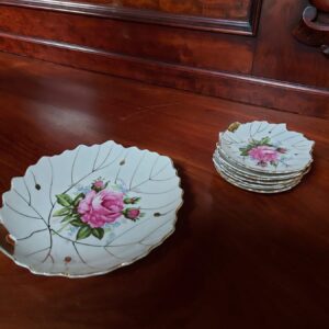 - Bladvormige serveerset bestaande uit een grote schaal en 7 kleinere bijpassende schaaltjes. Materiaal: porselein Leeftijd: Herkomst: onbekend Afmetingen schaal: doorsnede: 19 cm.
