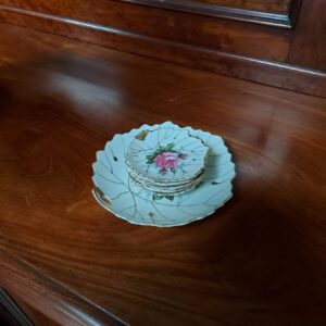 - Charmante set van zes antieke onderzetters (met originele doos). De onderzetters hebbe een zilverkleurige rand en een porseleinen binnenkant met bloemendecor. Ze zijn genummerd aan de onderzijde. Materiaal: metaal en porselein Leeftijd: ca. 1930 Herkomst: Nederland Afmetingen: Doorsnede: 7 cm.