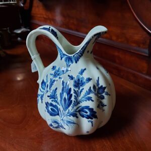 - Delfts blauwe schenkkan. Materiaal: aardewerk Leeftijd: jaren vijftig Herkomst: Nederland Delft Afmetingen: Hoogte: 20 cm. Doorsnede: 15 cm.