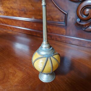 - Dit soort flessen werden van oudsher gebruikt om gasten bij aankomst te besprenkelen. Materiaal: glas en metaal Leeftijd: onbekend Herkomst: Marokko Afmetingen: Hoogte: 25 cm. Doorsnede: 9 cm.