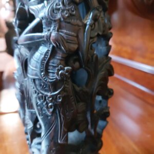 - Mogelijk een figuur uit de Chinese mythologie of folklore. De man draagt een vis op zijn rug en heeft een zak in zijn hand wat kan duiden op welvaart en geluk. Het beeld is waarschijnlijk een voorbeeld van Dongyang housnijwerk. Materiaal: hout Leeftijd: 19e eeuw Herkomst: China Afmetingen: Hoogte: 36 cm.