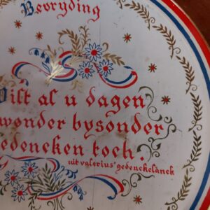 - De tekst op het bordje is "1945 Bevrijding Wilt al u dagen Dit wonder bysonders Gedencken toch". Materiaal:metaal Leeftijd: 1955 Herkomst: Nederland Afmetingen: Doorsnede: 16,5 cm.