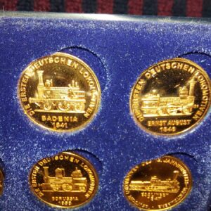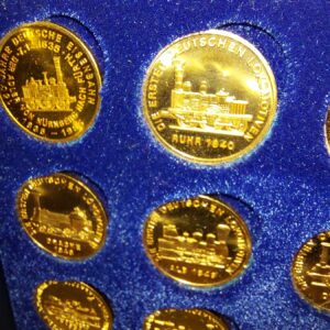 - Verzameling munten ter gelegenheid van 150 jarig jubileum van de Duitse spoorwegen. Materiaal: brons Leeftijd: 1985 Herkomst: Duitsland Afmetingen: lengte: 15 cm. Breedte: 12 cm.