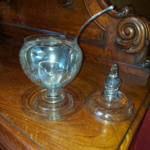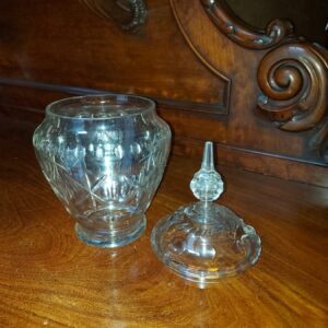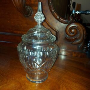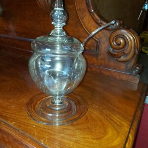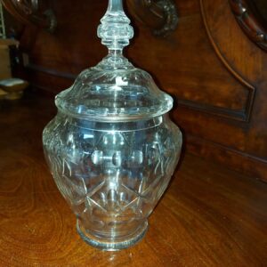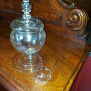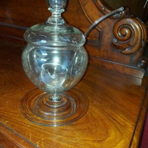 - Oude pot met een uitsparing voor een lepel. Materiaal: glas/kristal Leeftijd: begin 20ste eeuw Herkomst: nederland Afmetingen: Hoogte: 31 cm. Doorsnede: 15 cm.