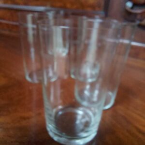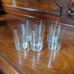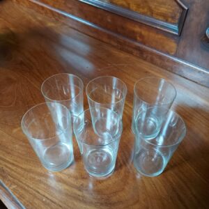 - Serie van 6 glazen Materiaal: glas Leeftijd: ca. 1940 Herkomst: Nederland Afmetingen: Hoogte: 12 cm. Doorsnee: 5 cm. Diepte: .. cm.
