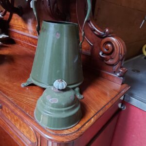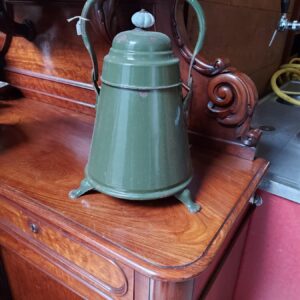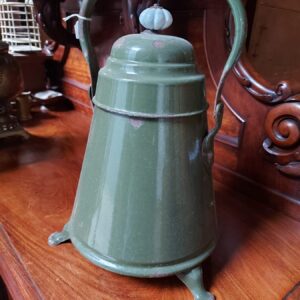 - Emaille doofpot met leeuwenpootjes, goudbiezen en een porseleinen knop. In gebruikte staat. Materiaal: metaal en porselein Leeftijd: jaren dertig Herkomst: Nederland Afmetingen: Hoogte: 40 cm. Doorsnede: 28 cm.