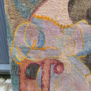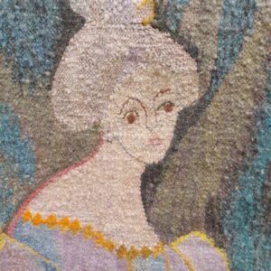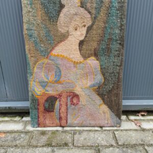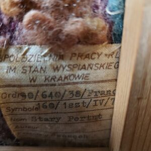 - Gobelin met de titel Stary Portrut. Voorstellende de afbeelding van een vrouw gemaakt door een Poolse kunstenaar. Materiaal: stof en hout Leeftijd: mogelijk 1938 Herkomst: Krakow Polen Afmetingen: Hoogte: 70 cm. Breedte: 50 cm. Diepte: .. cm.