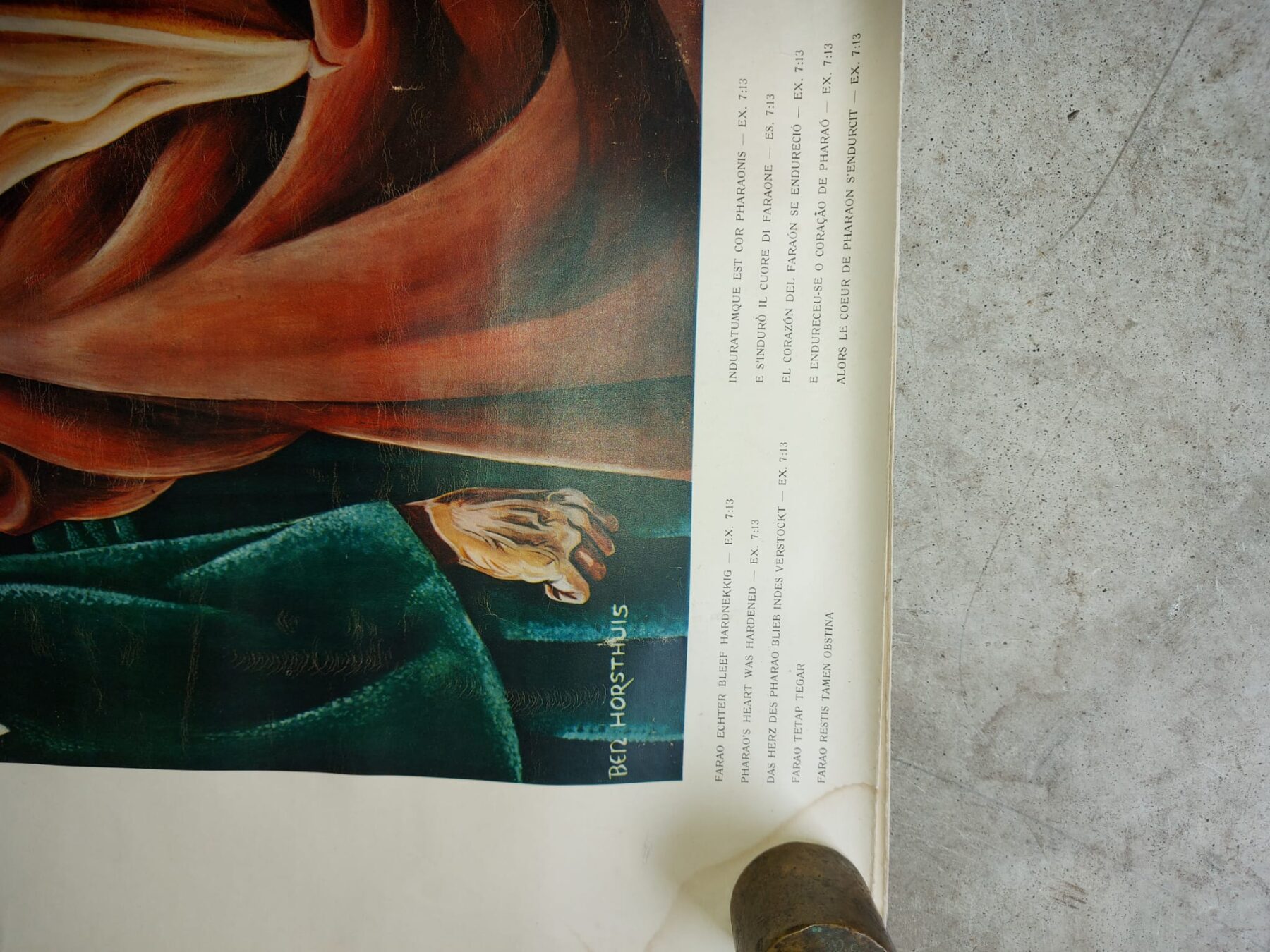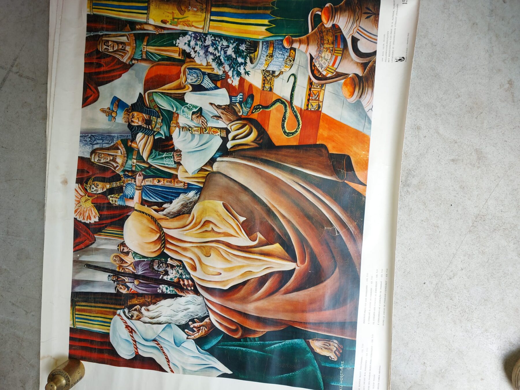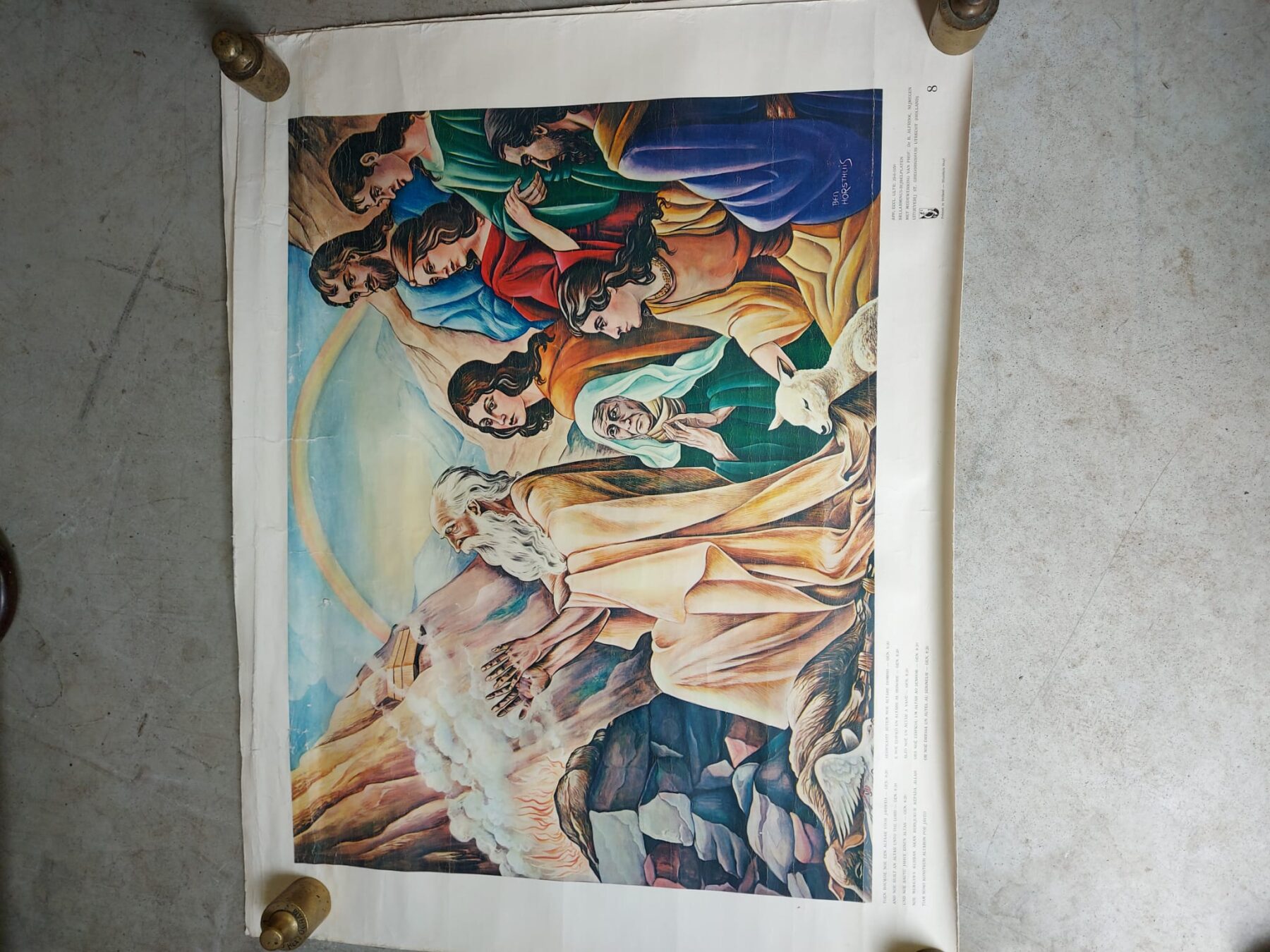 4 oude Bijbelse schoolplaten van Bellarminus  voorstellende: David en Goliath, het Abrahams offer, een altaar voor Jaweh en Jozef en zijn broers
