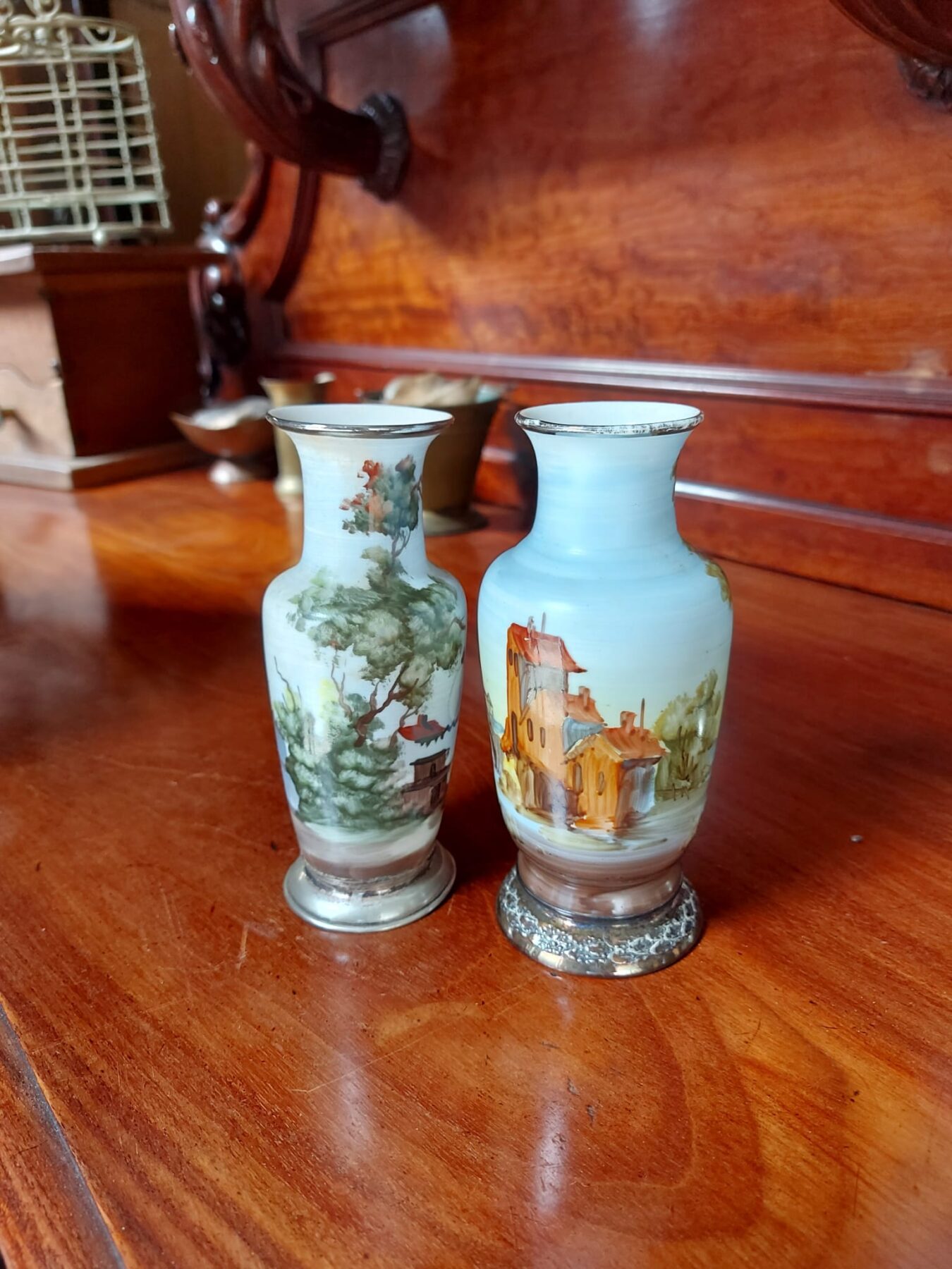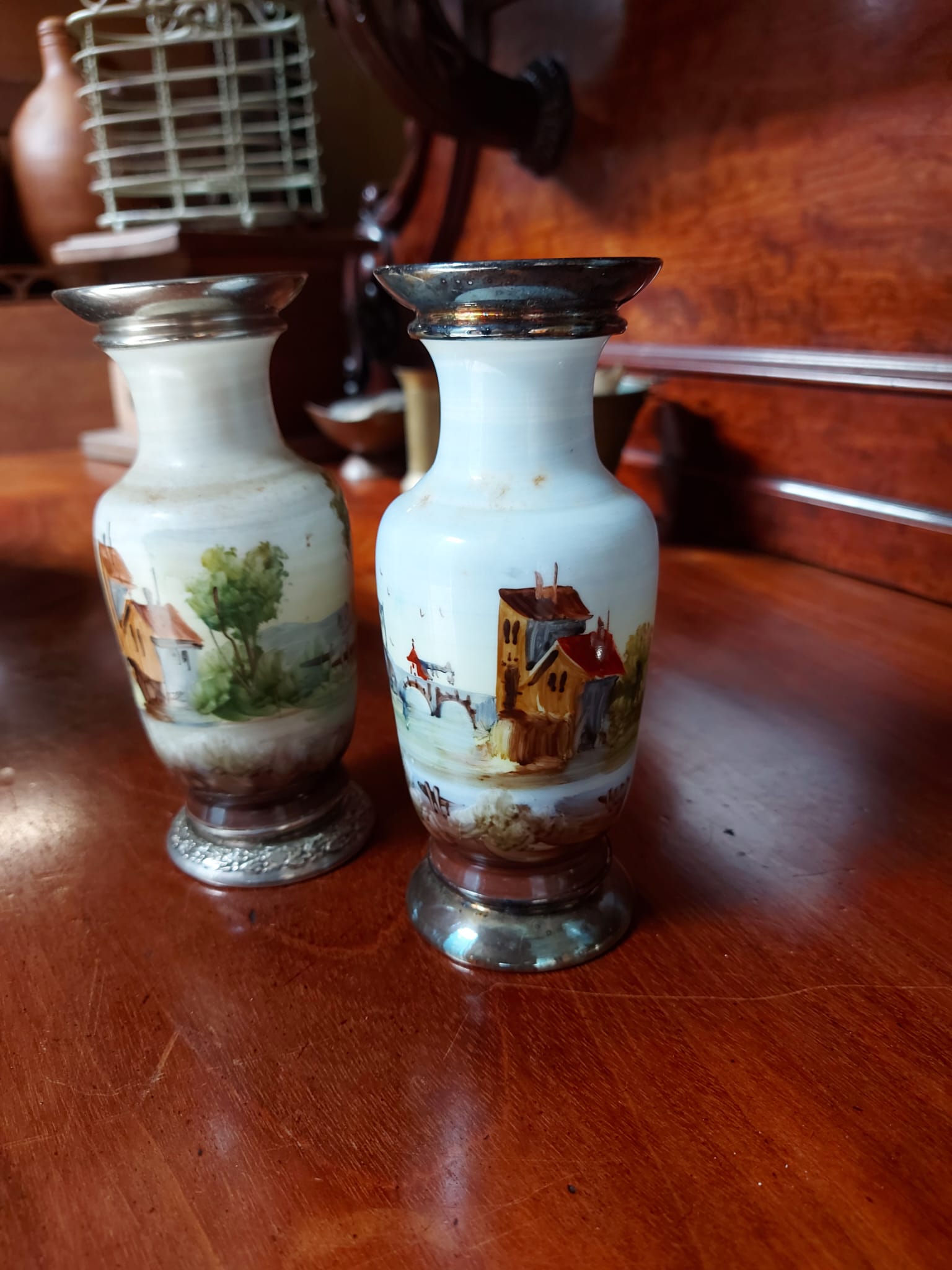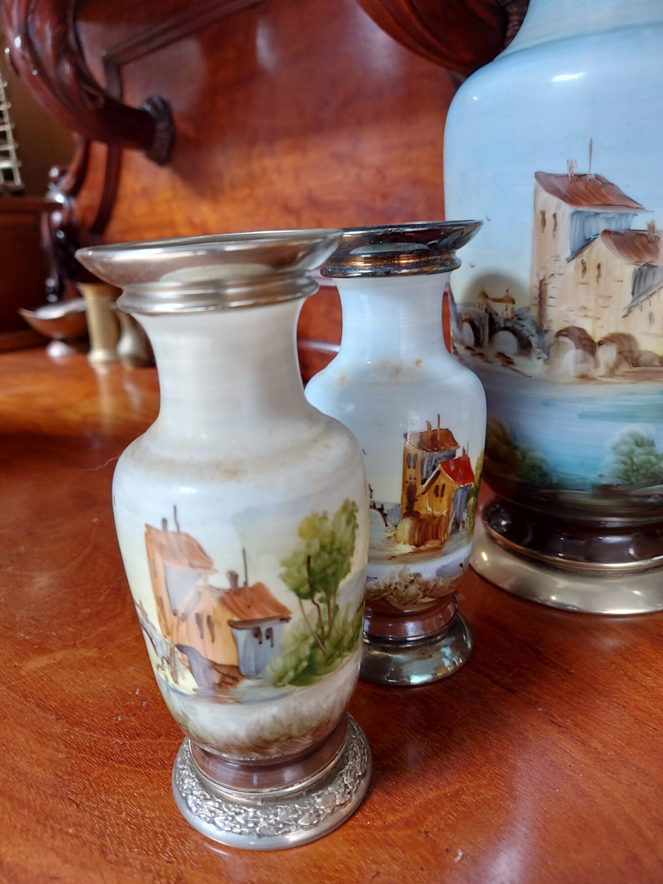 de grote vaas is 28 cm hoog, 2 kleinere vaasje met metalen ring 16 cm hoog en de 2 vaasjes zonder metalen ring 15 cm hoog