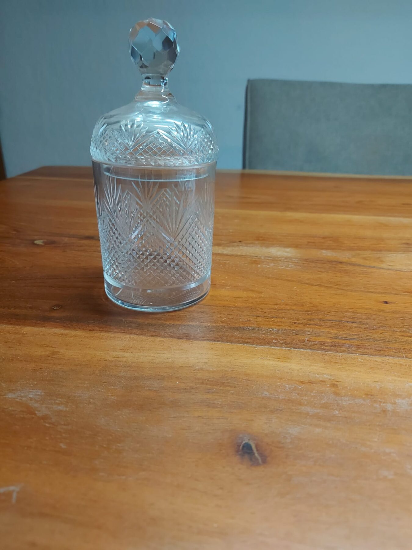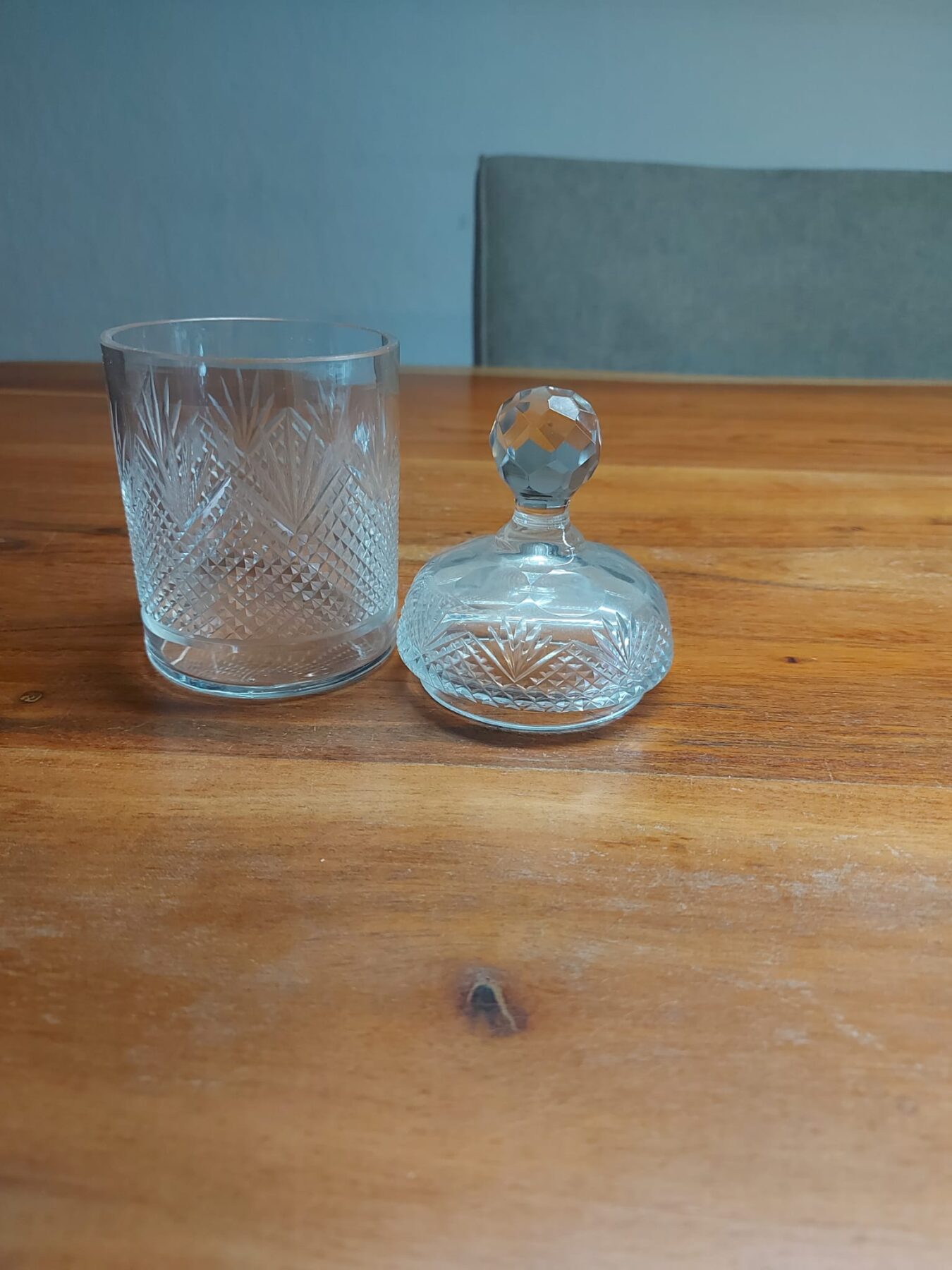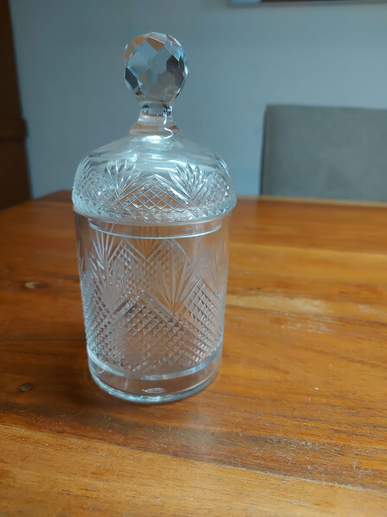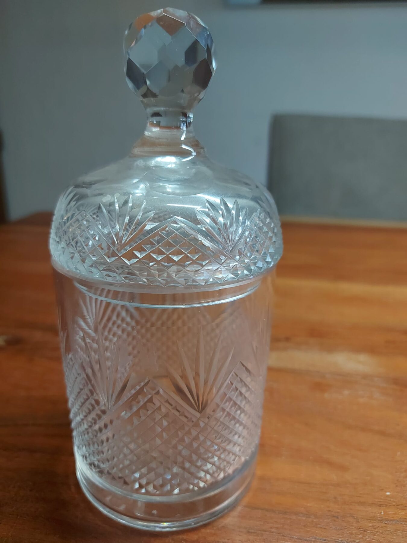 mooi vormgegeven kristallen potje met ruit- en waaiermotieven.