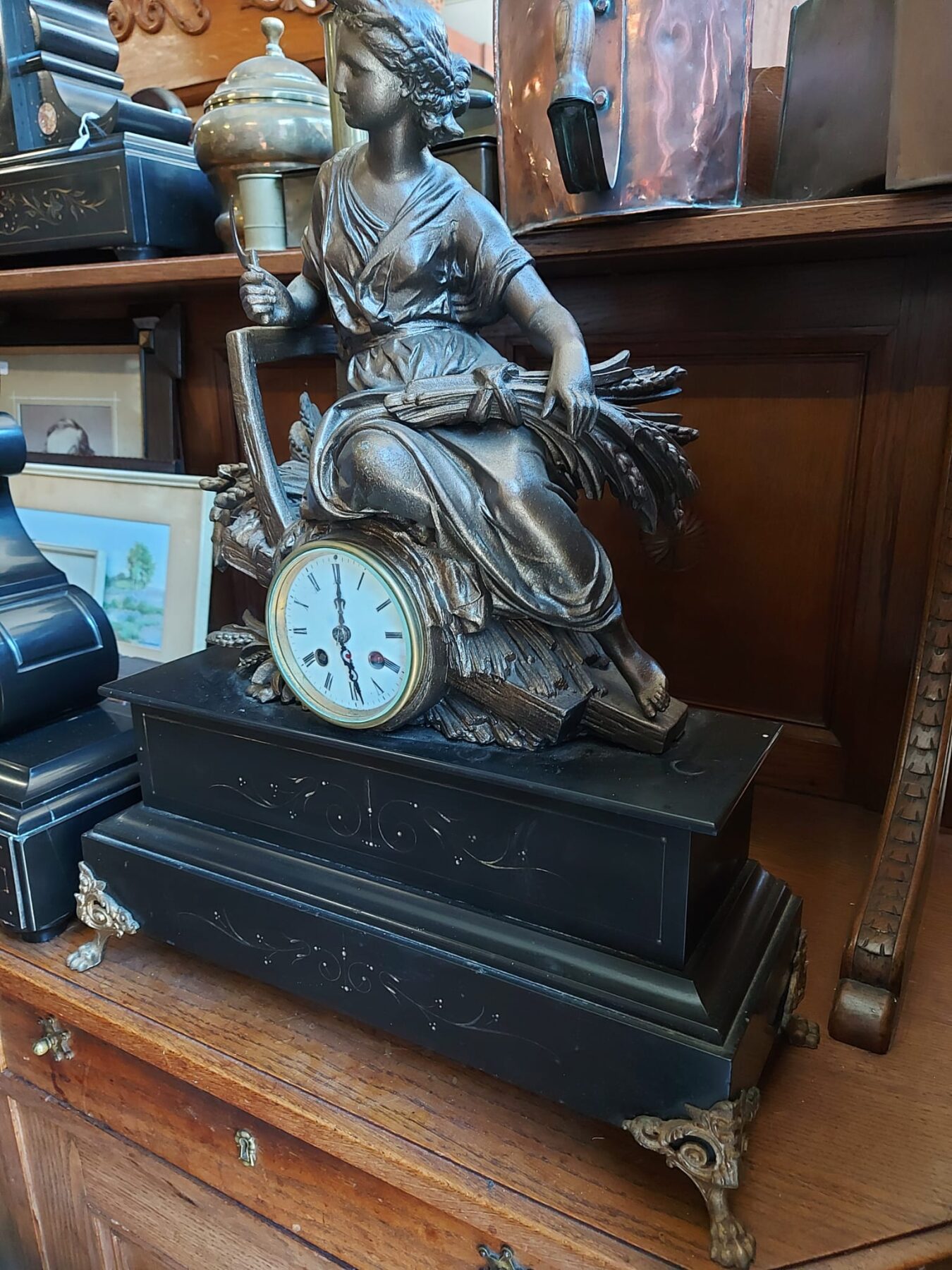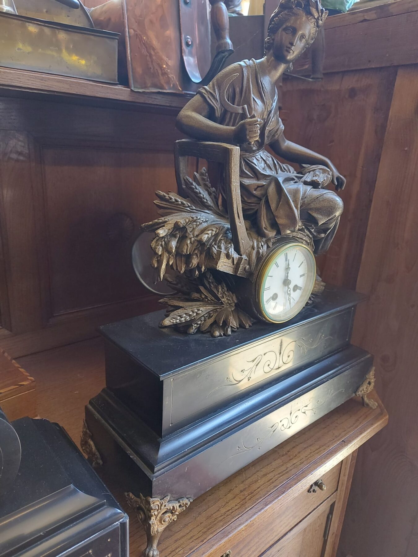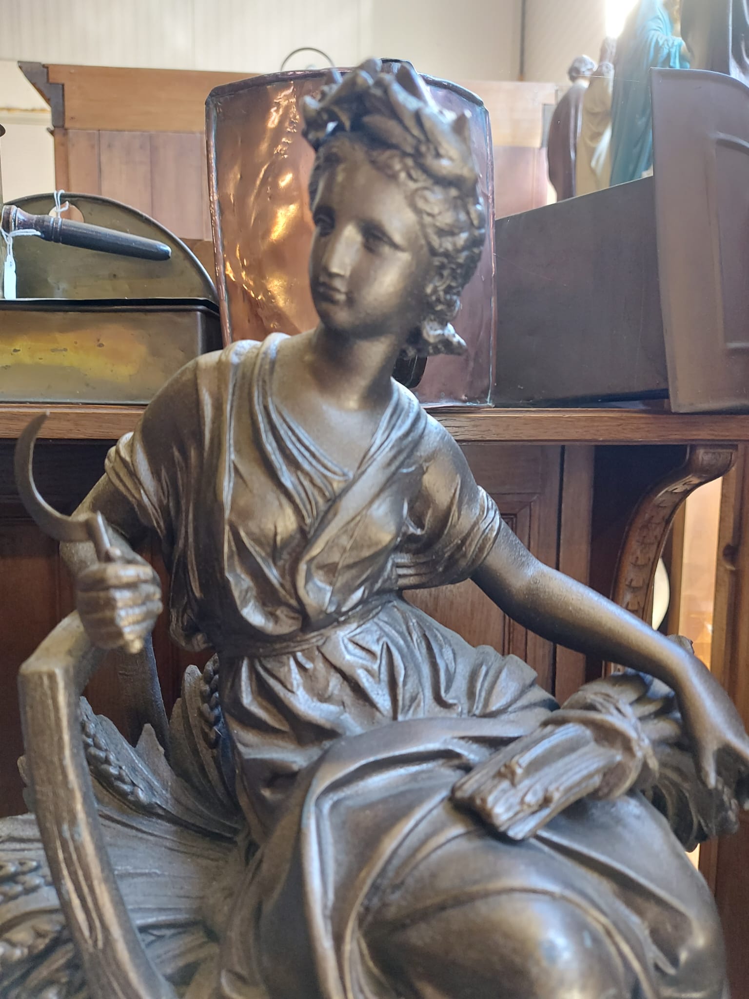 Antieke schouwklok met een brozen beeld van een vrouw die een sikkel en tarwe vasthoudt.