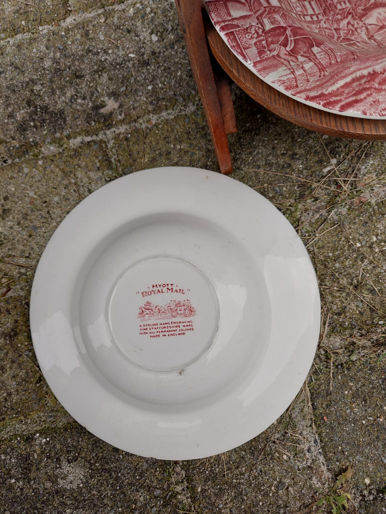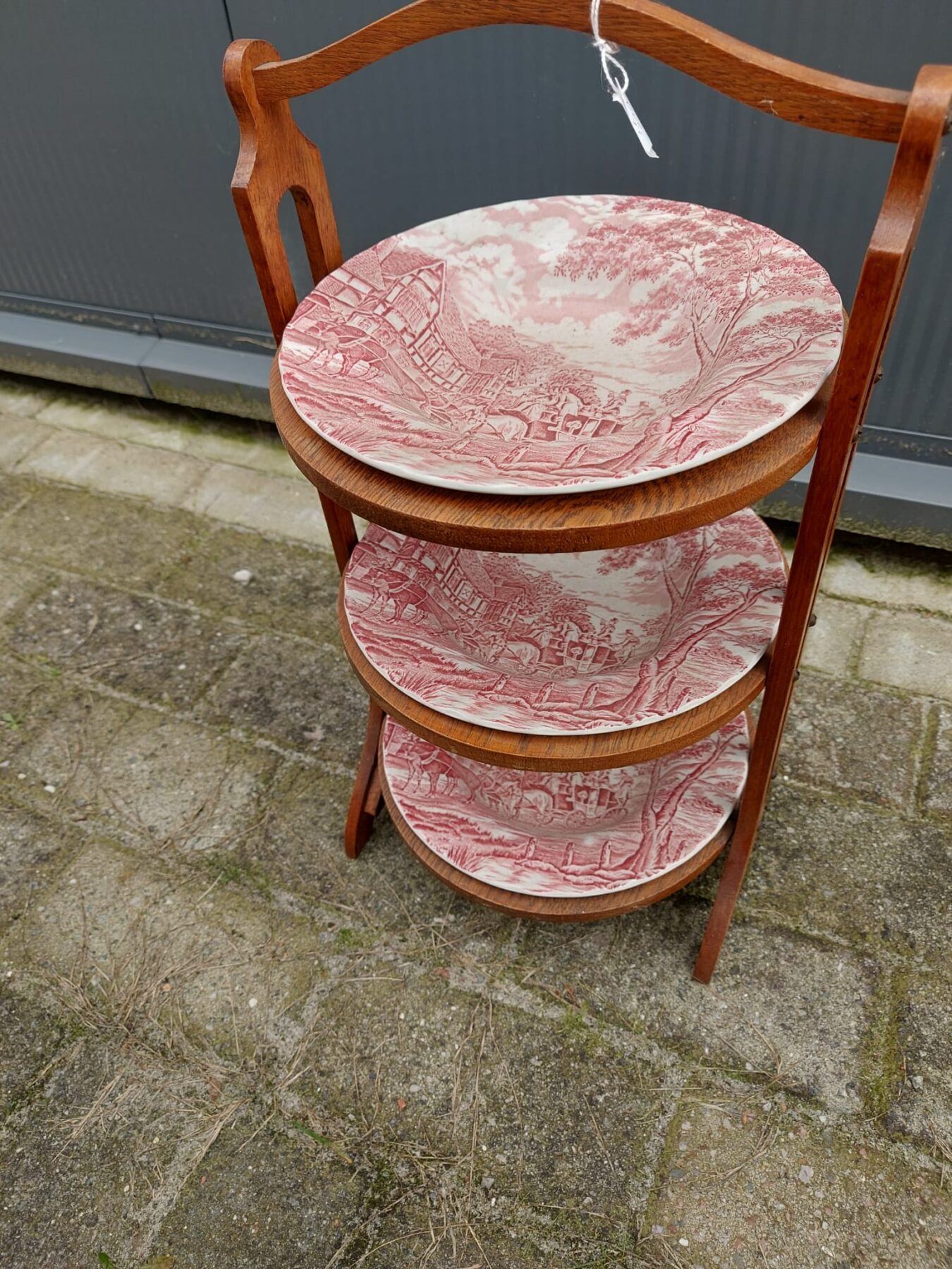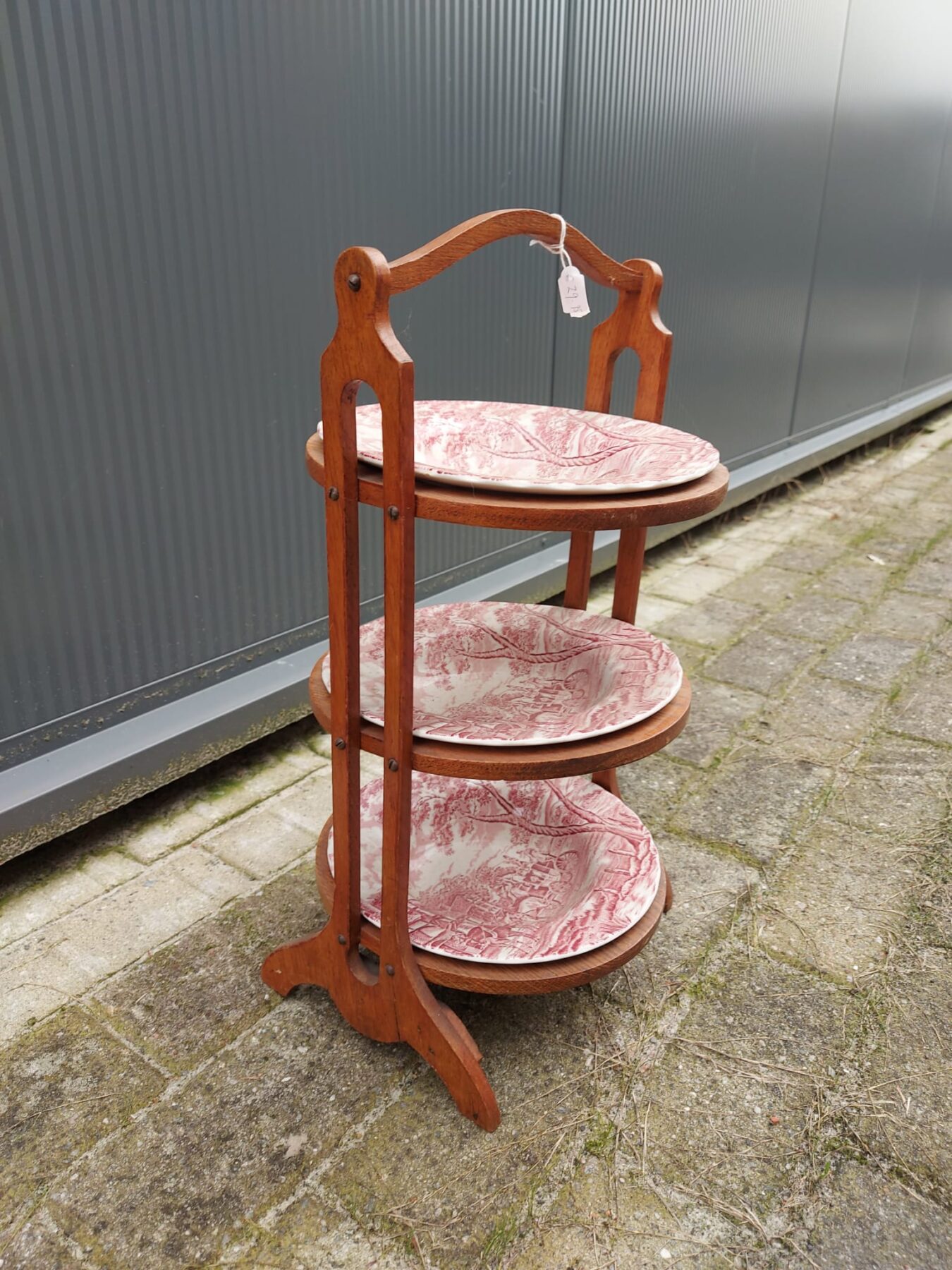 De standaard is gemaakt van mahonie en heeft drie niveaus voorzien van borden met een rood-wit patroon.