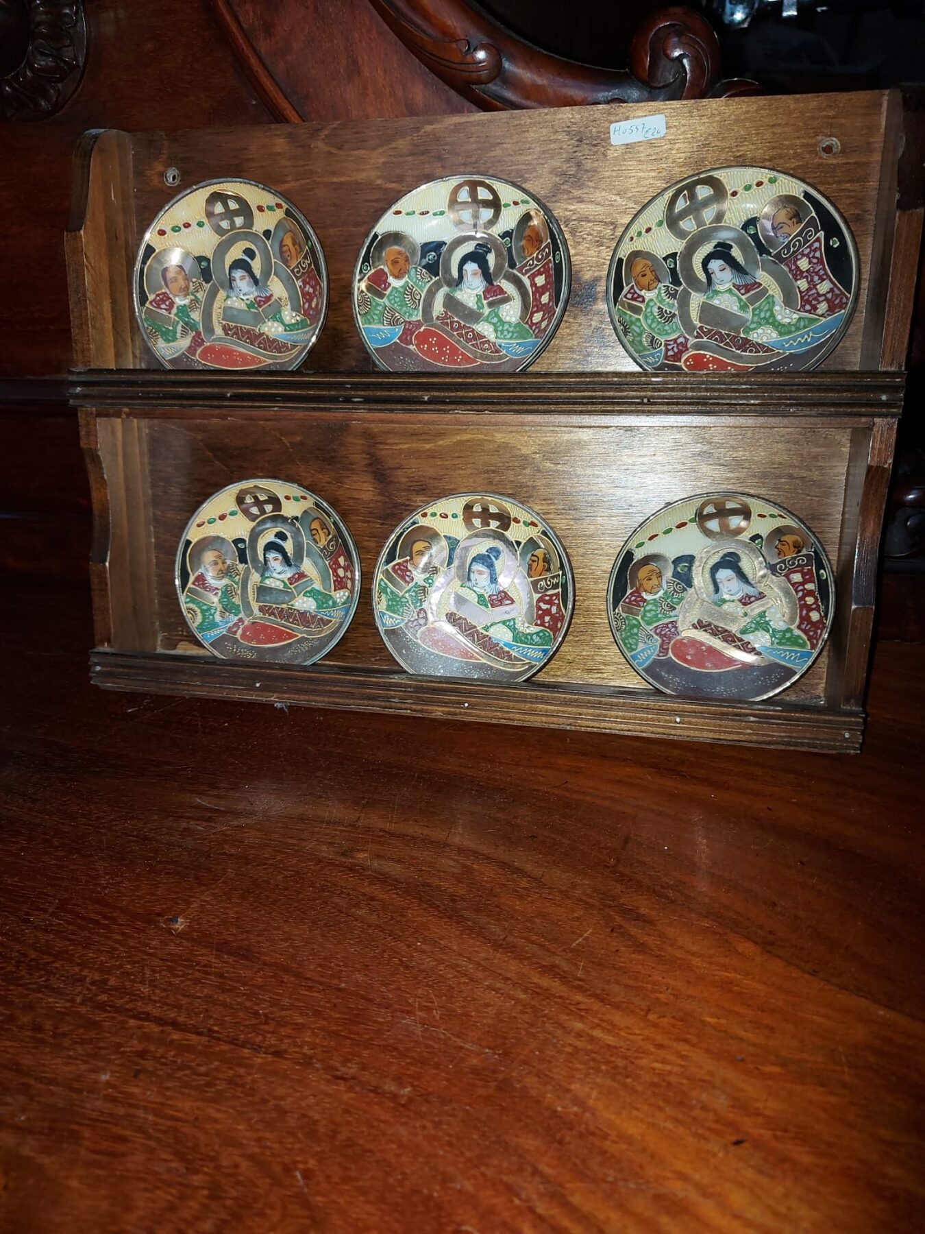 Antiek bordenrek met daarop 6 wandborden  met het opschrift Societe Ceramique Maestricht en het decor Hollandia.