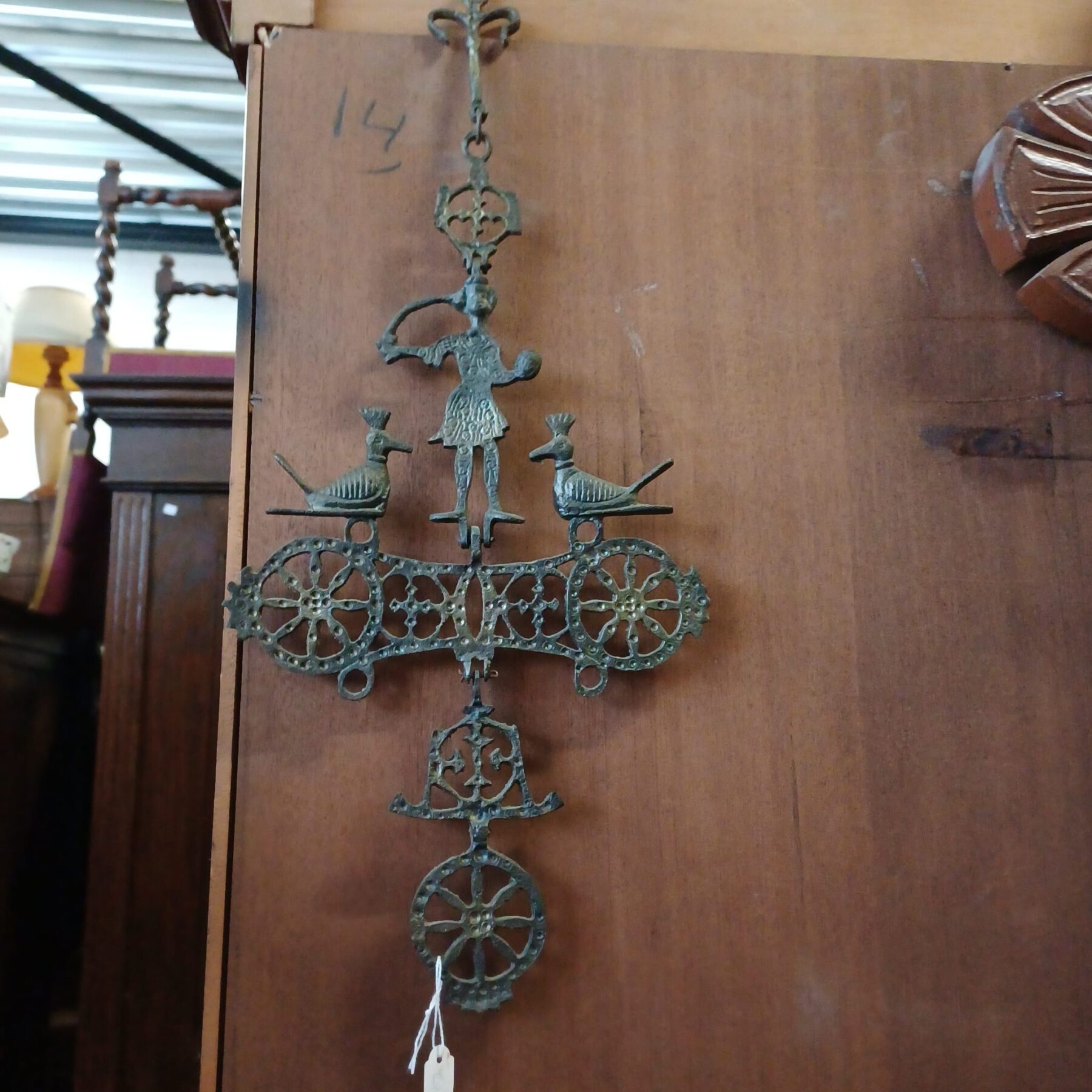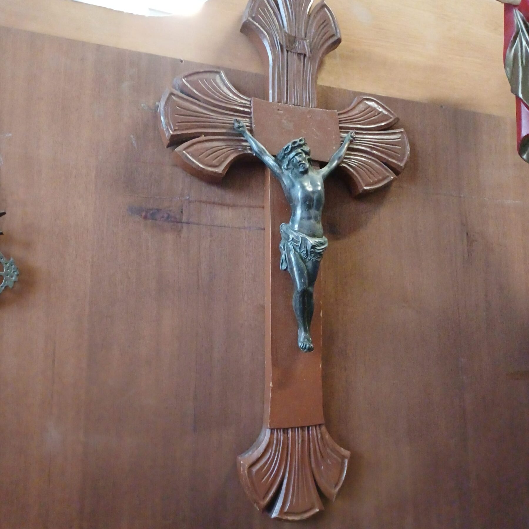 Oud en primitief houten kruisbeeld met een metalen jezus figuur.