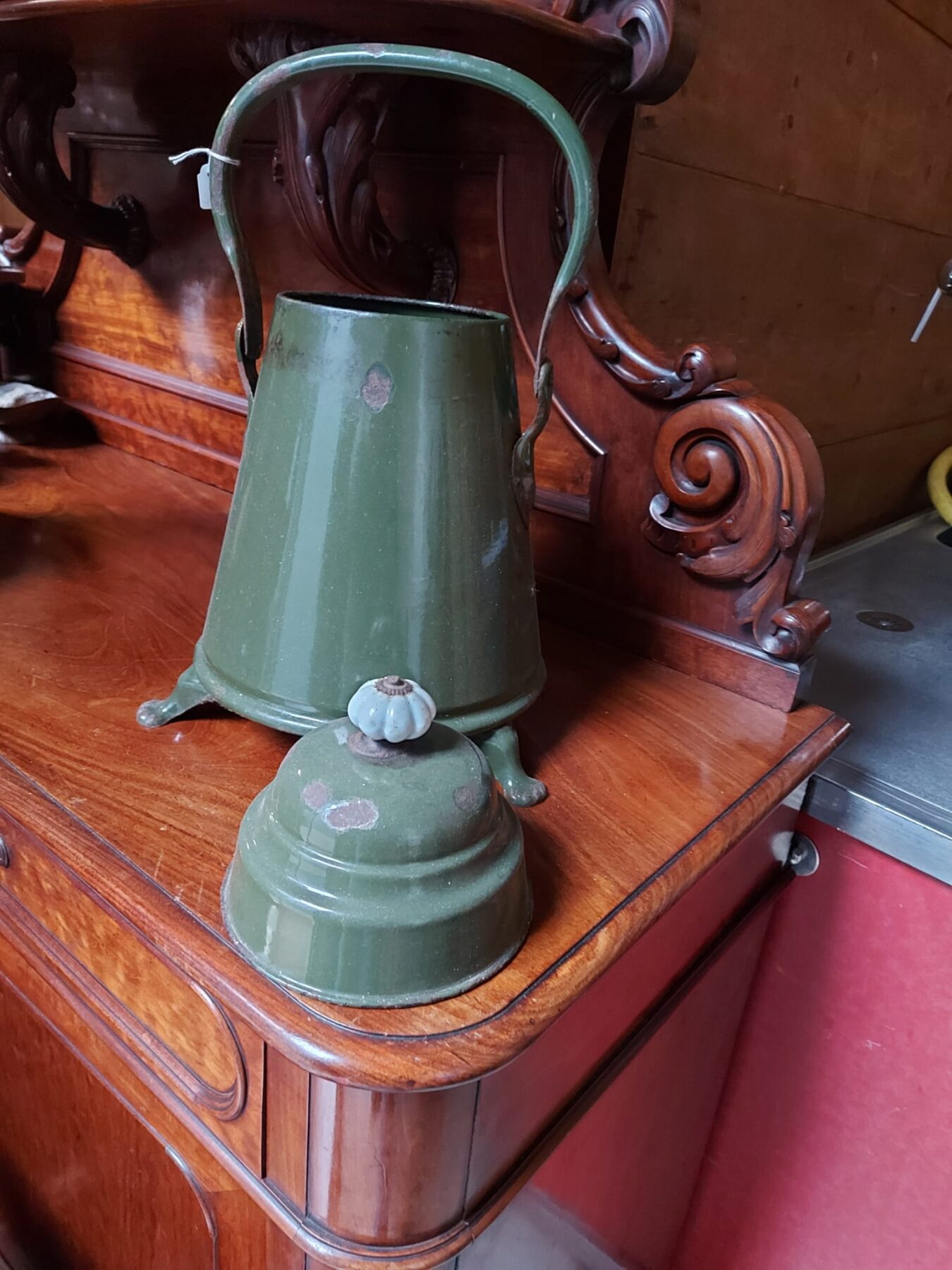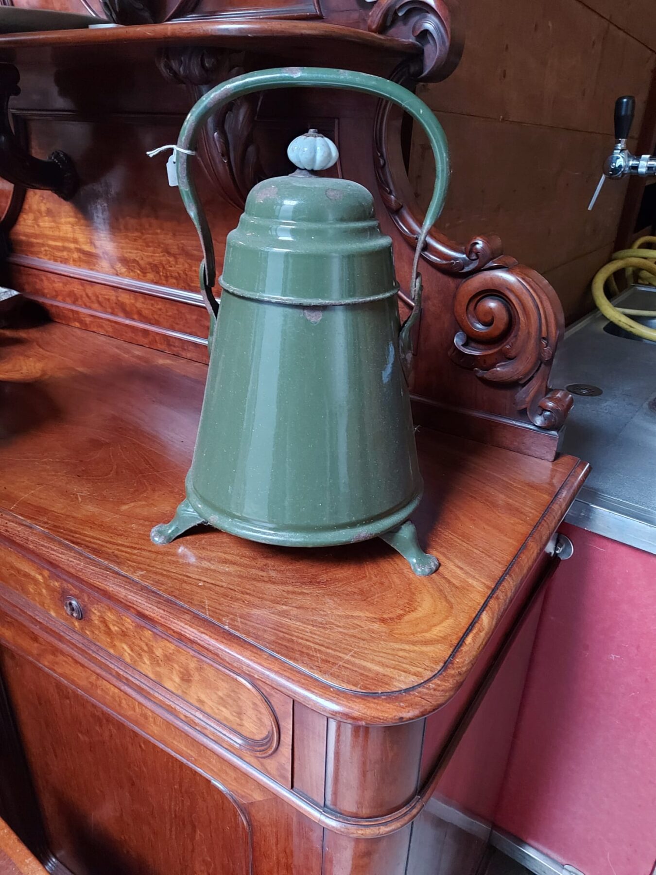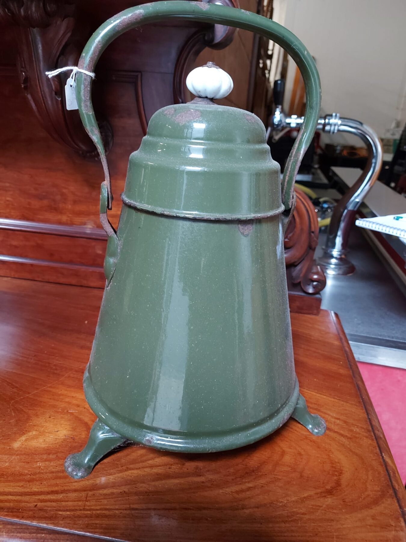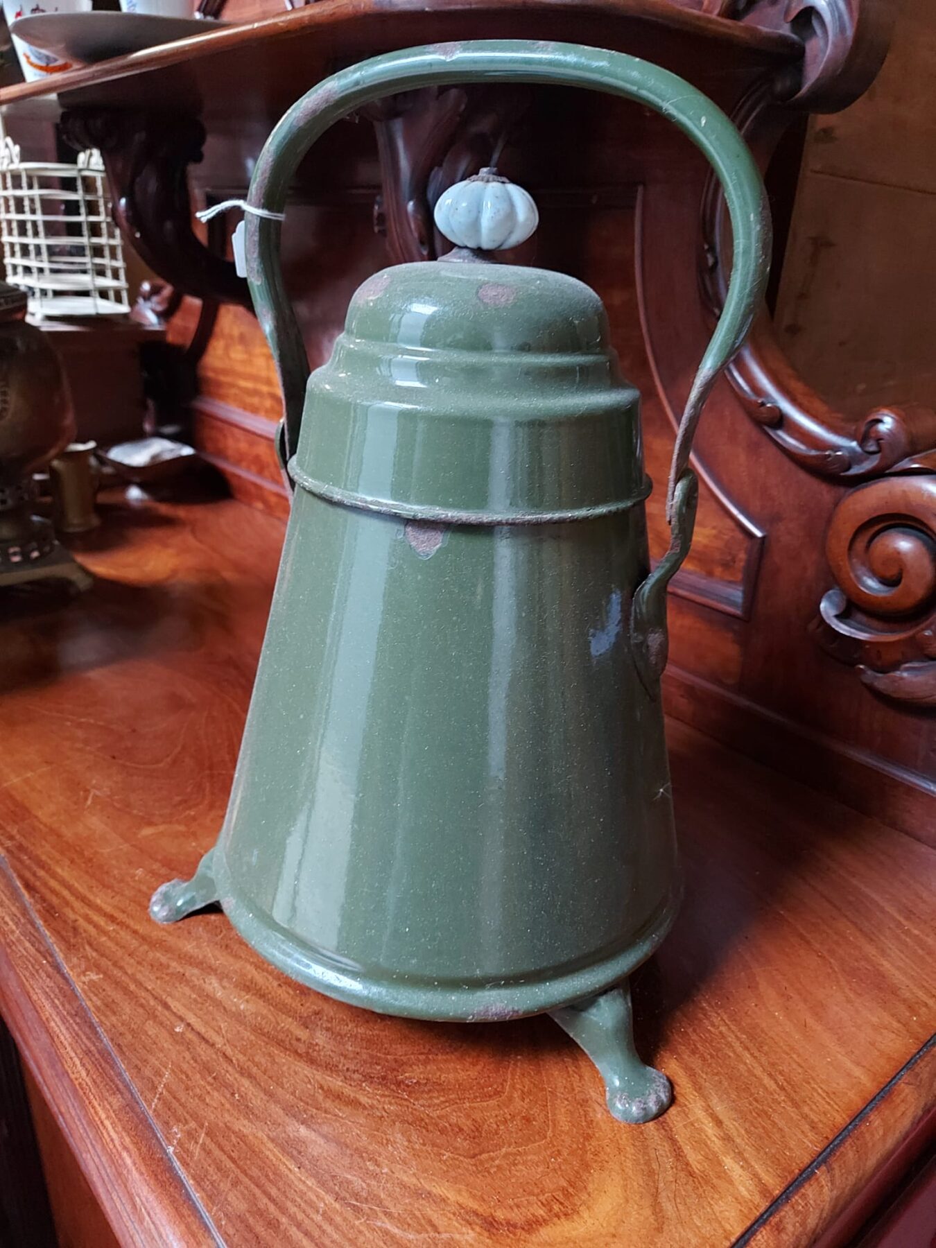 Emaille doofpot met leeuwenpootjes, goudbiezen en een porseleinen knop. In gebruikte staat.