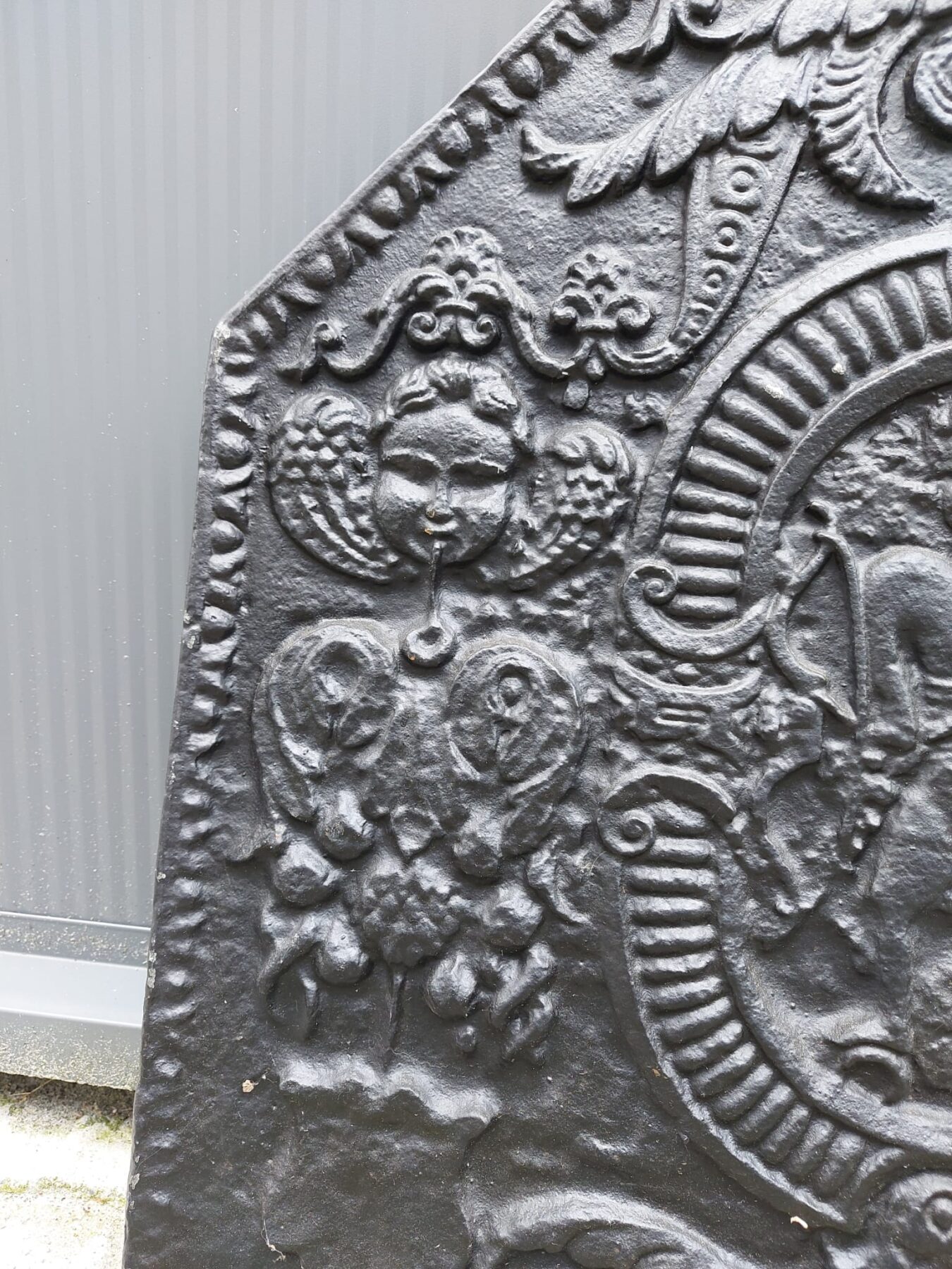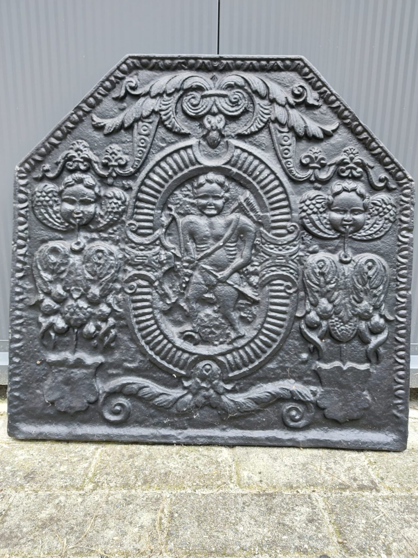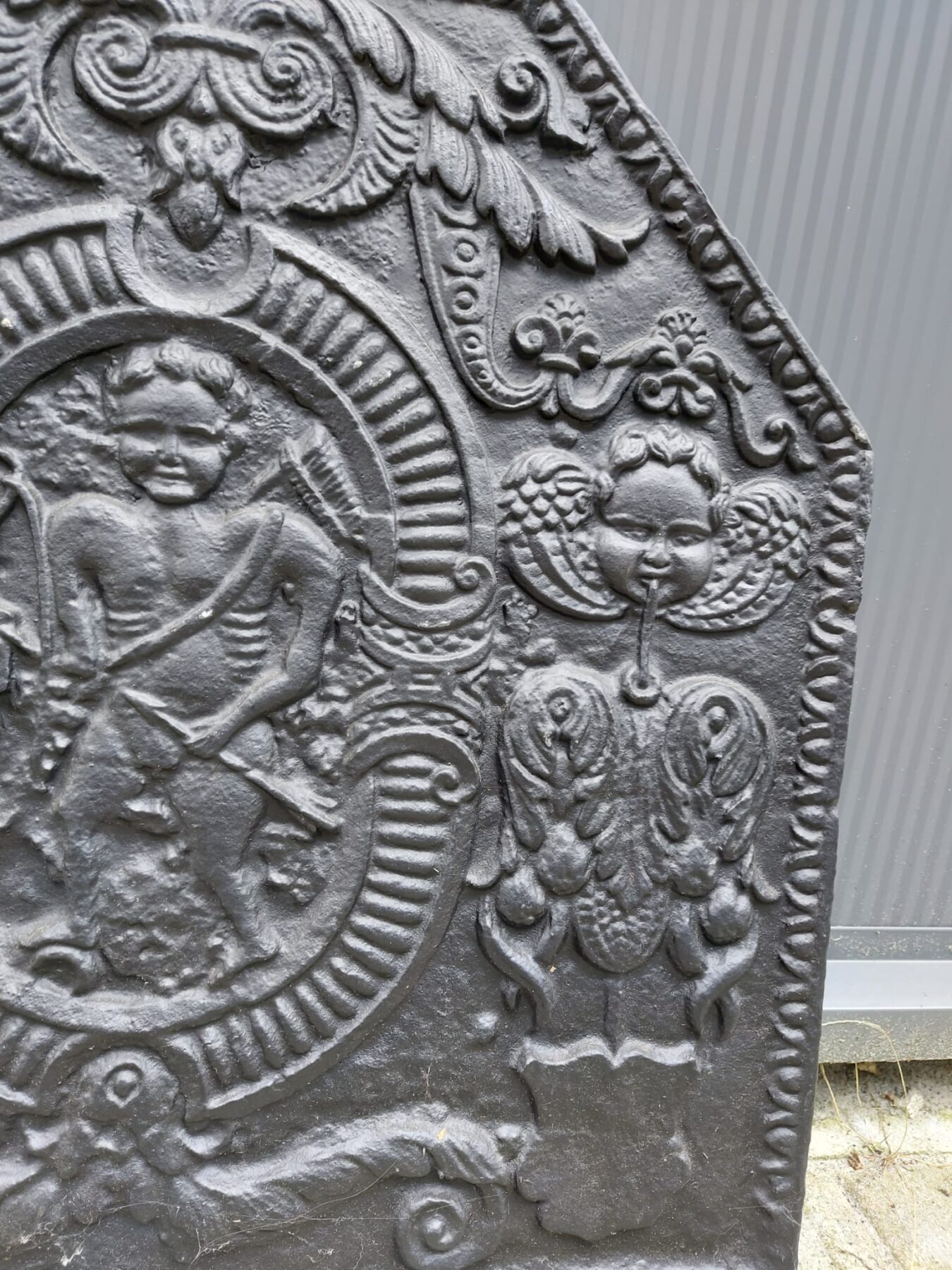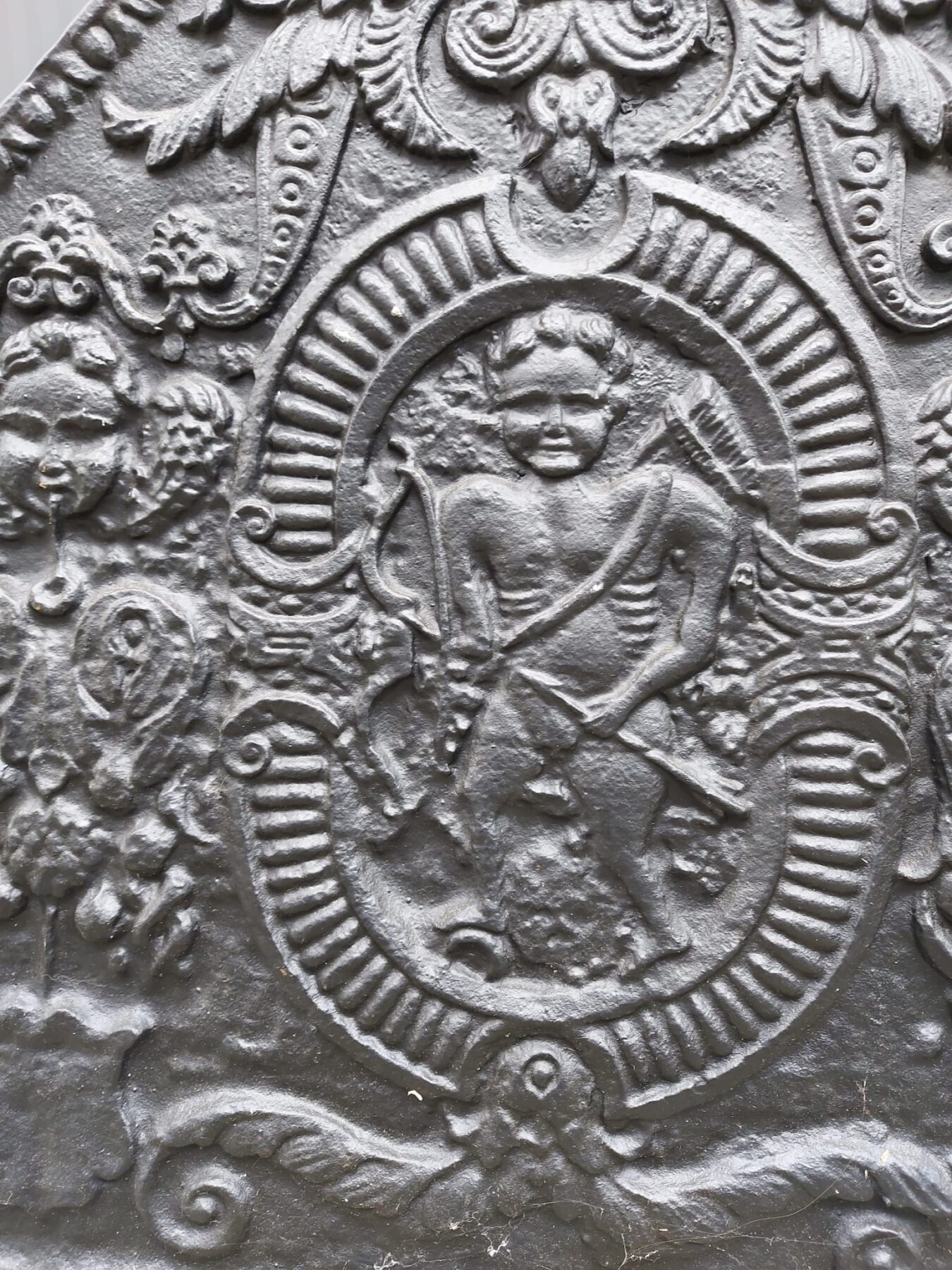 haardplaat of vuurplaat met een afbeelding van cupido. Werd tegen de achterwand van de openhaard geplaatst