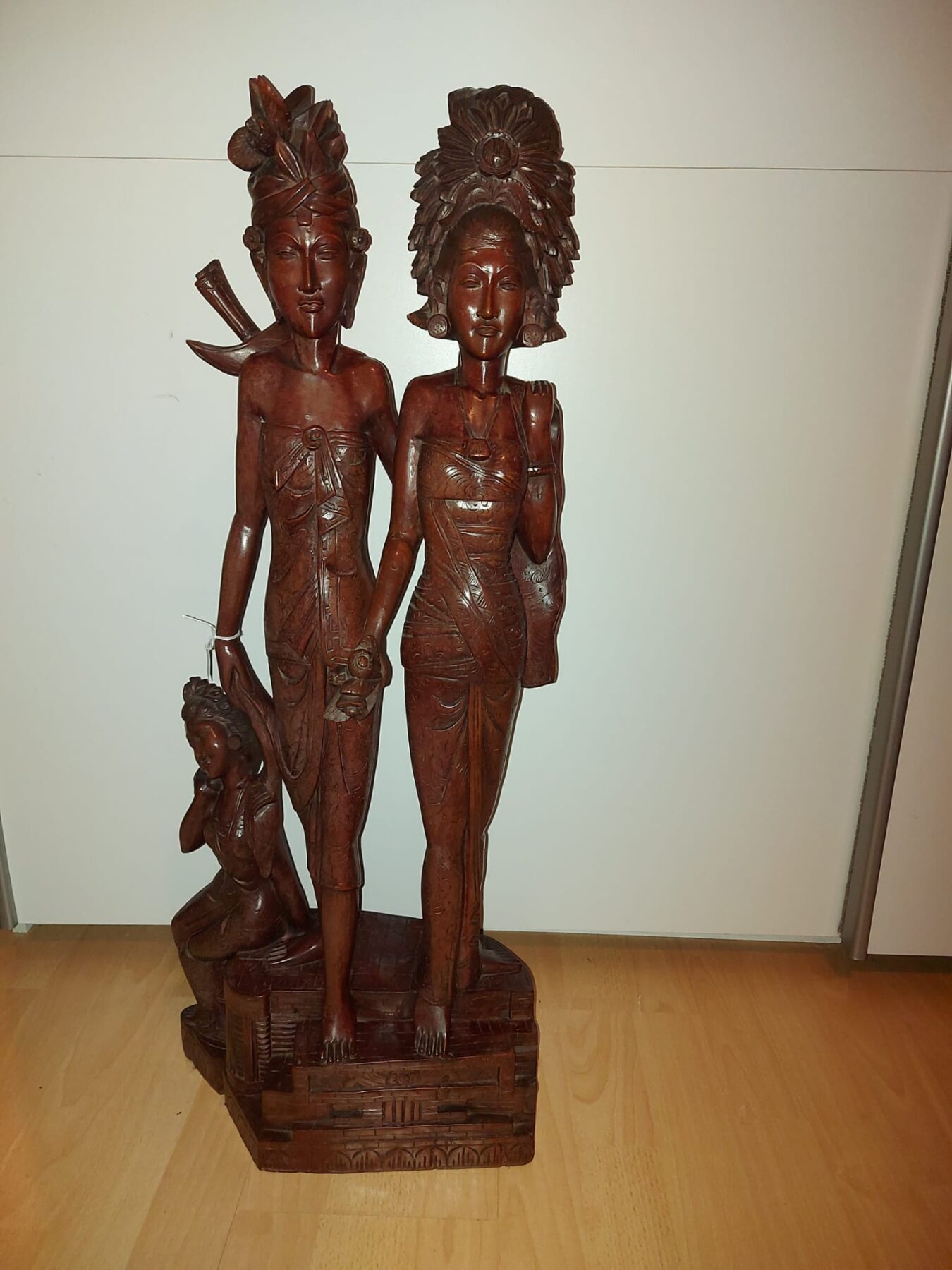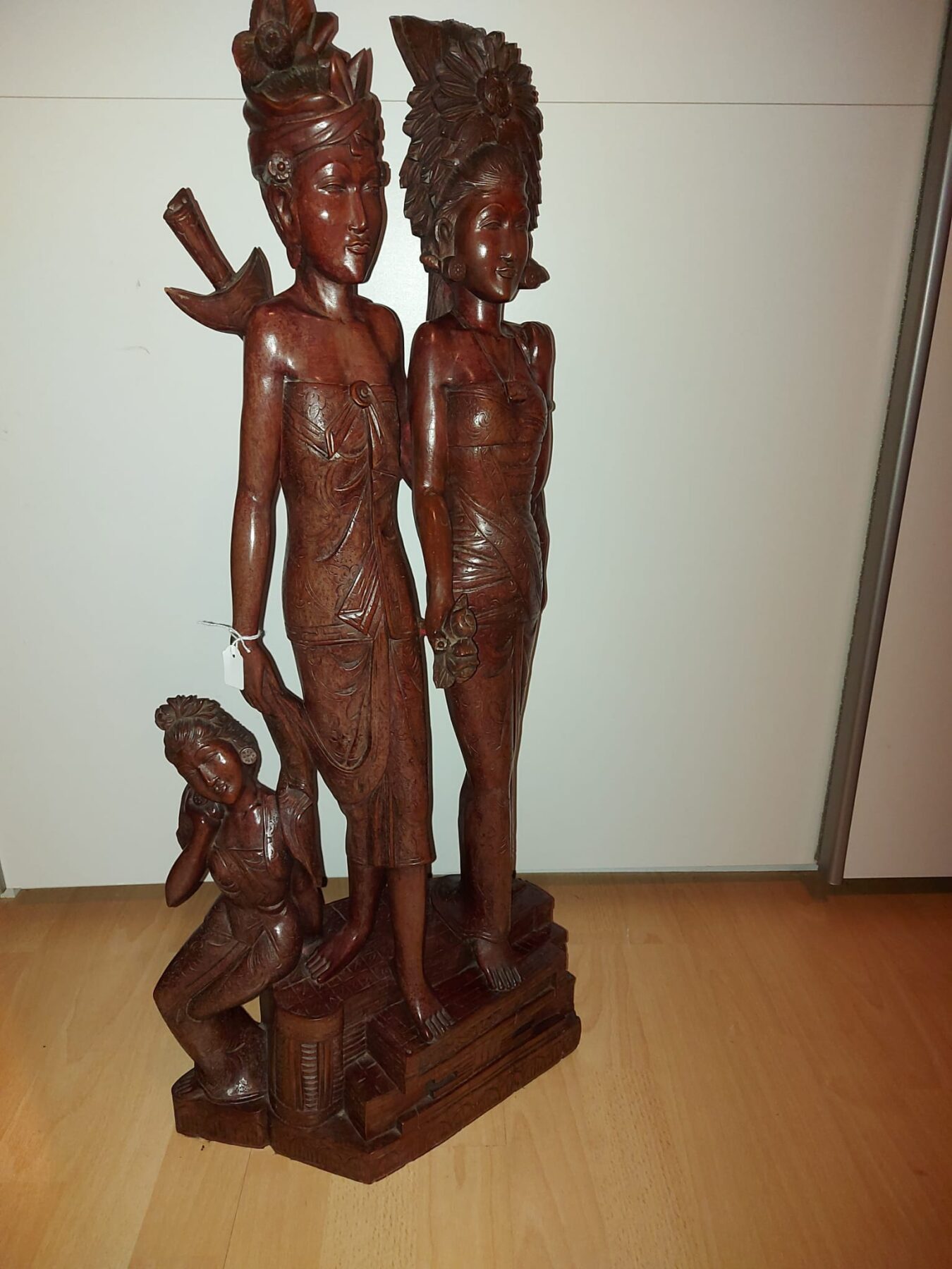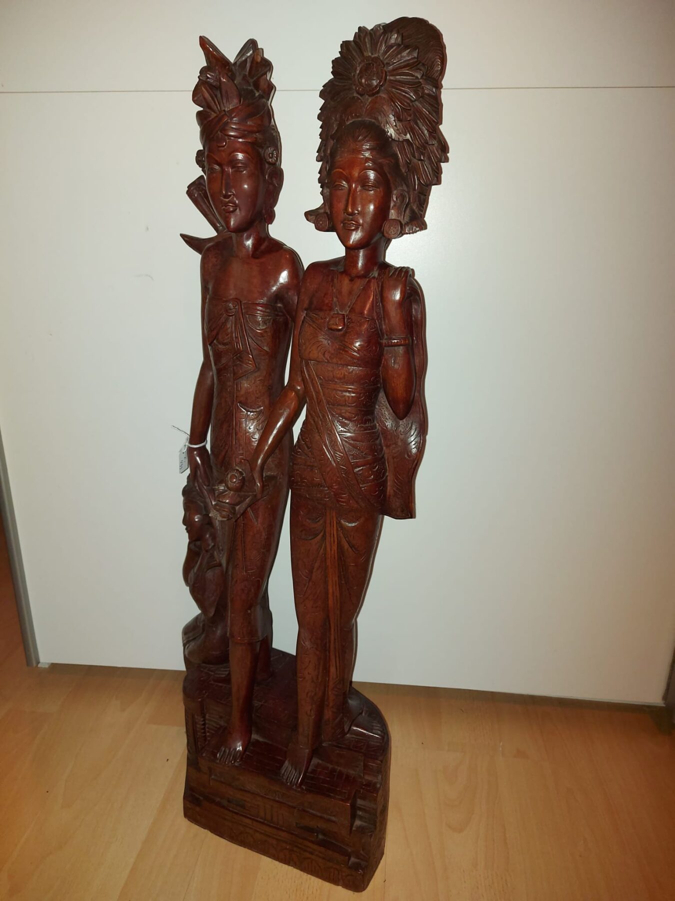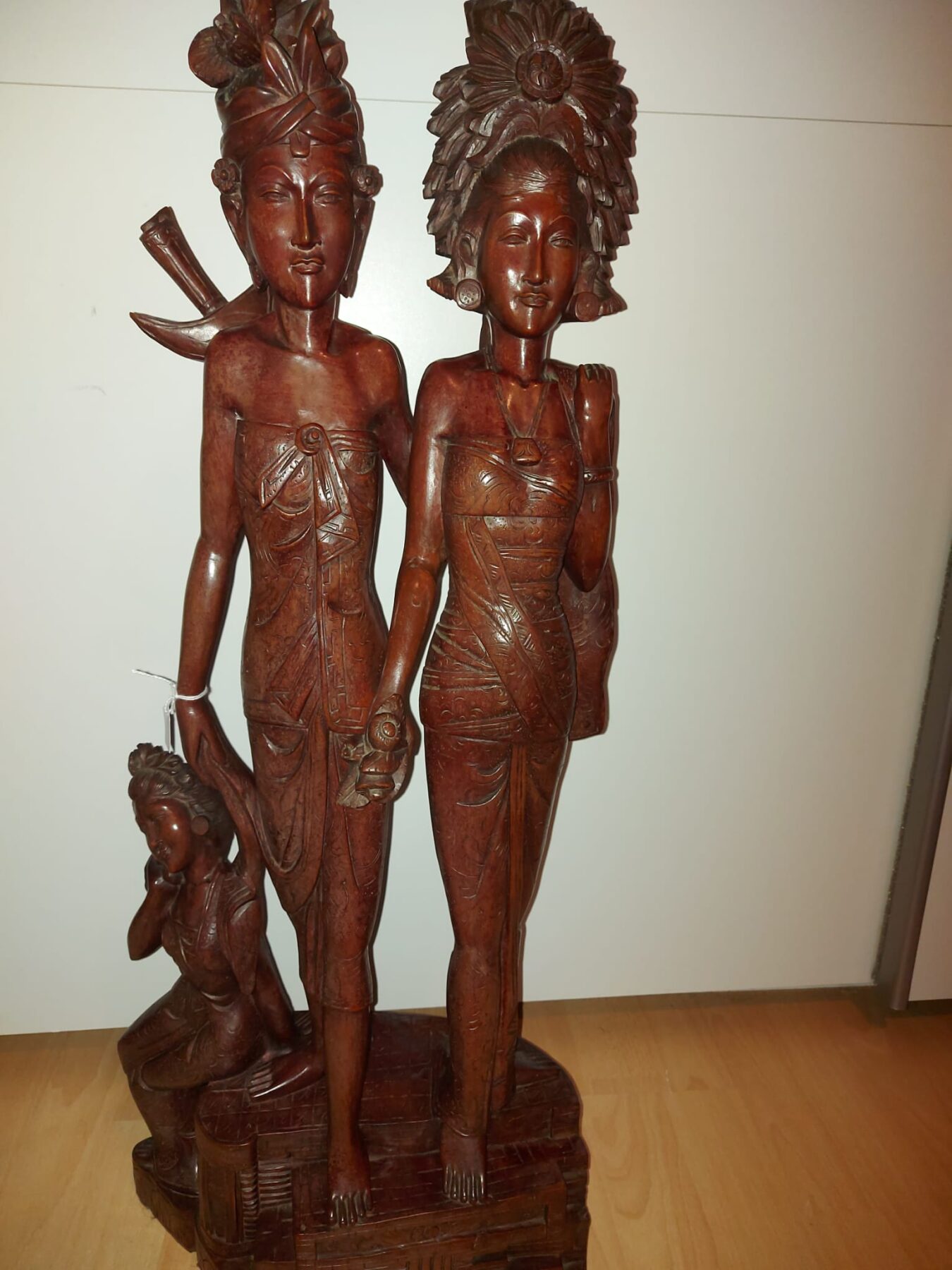Houten beeld van een man en vrouw met kind in traditionele kleding.