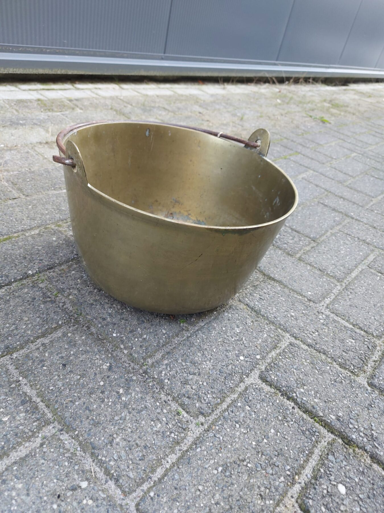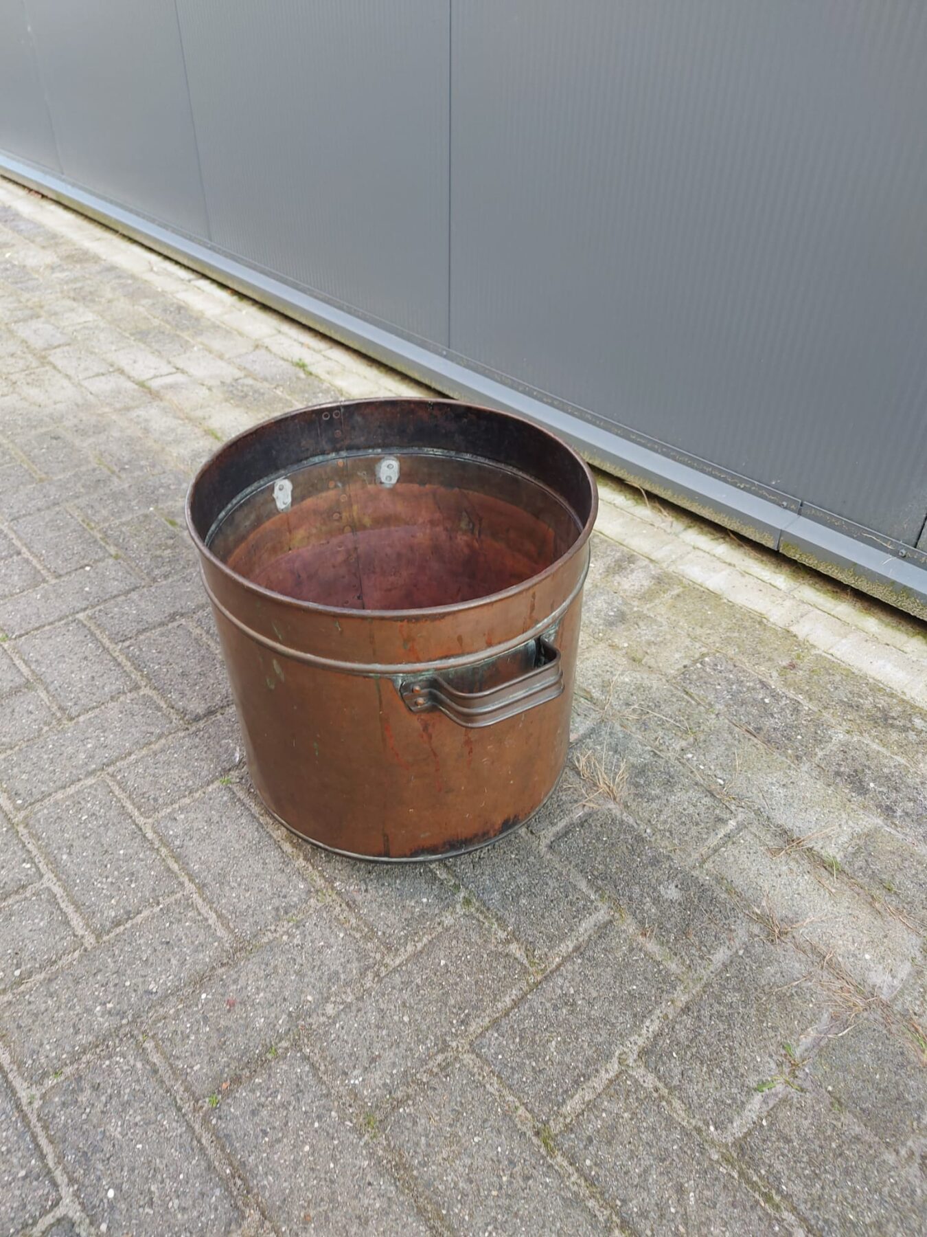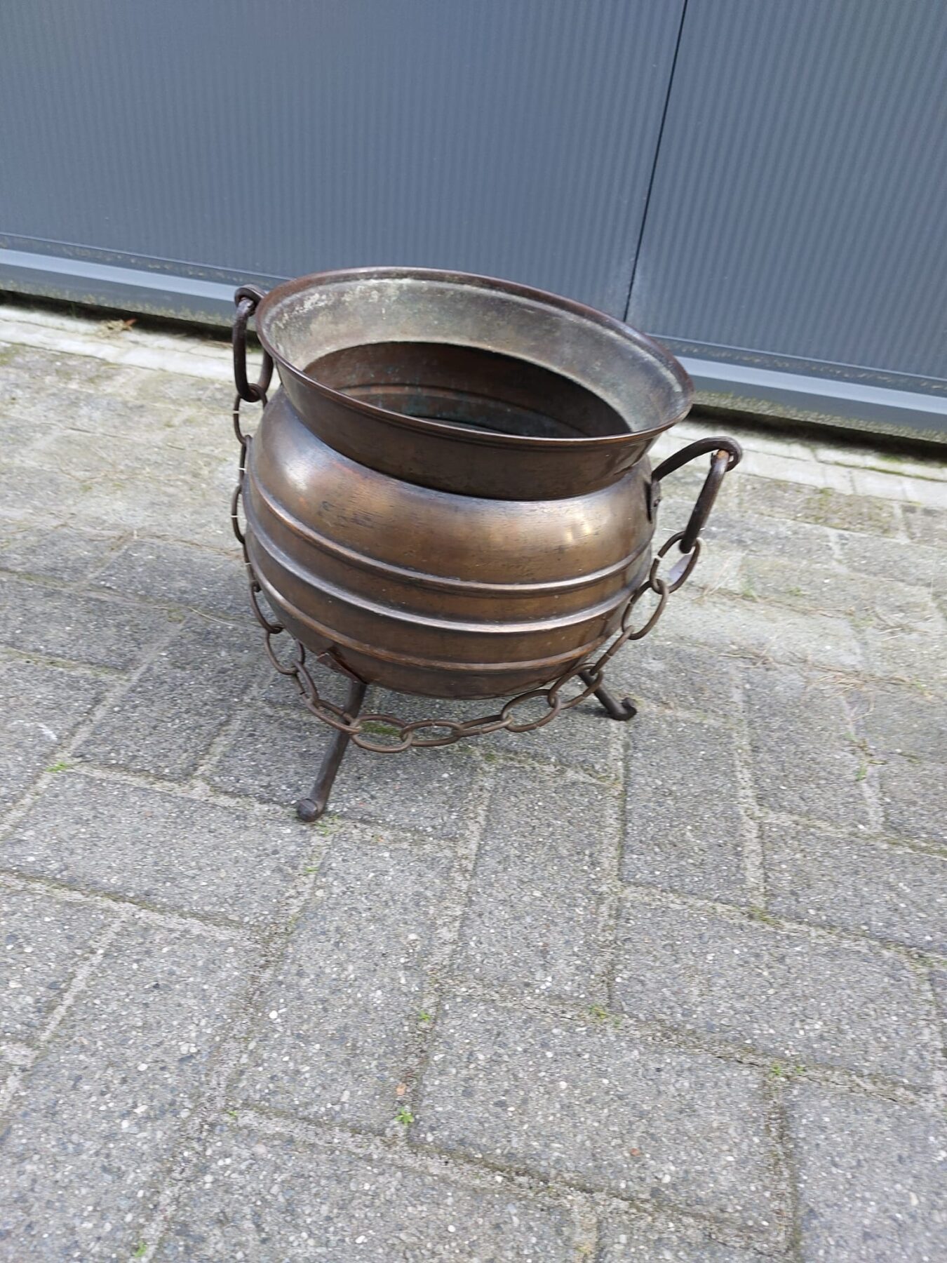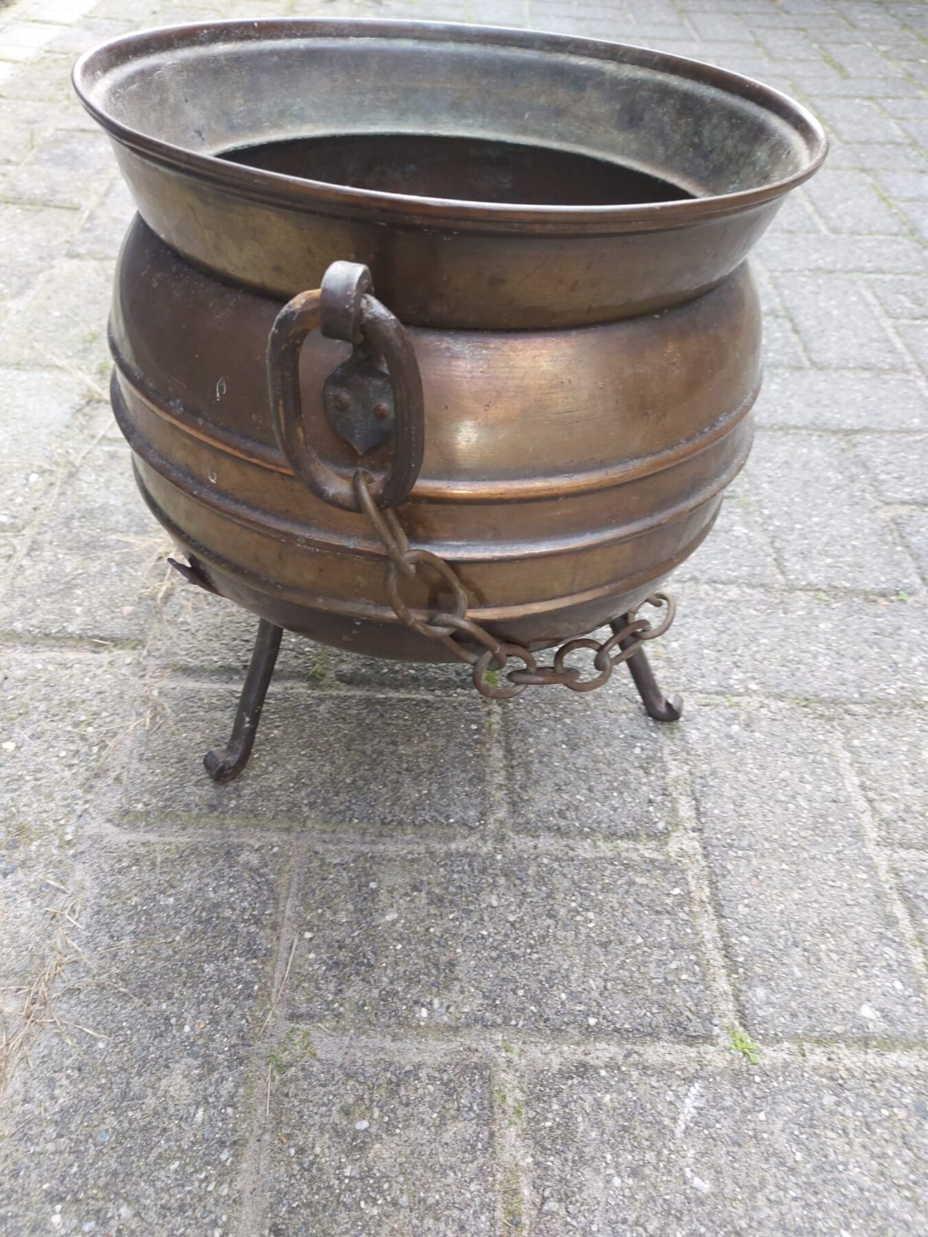 Koperen pot met handvatten, ketting en poten