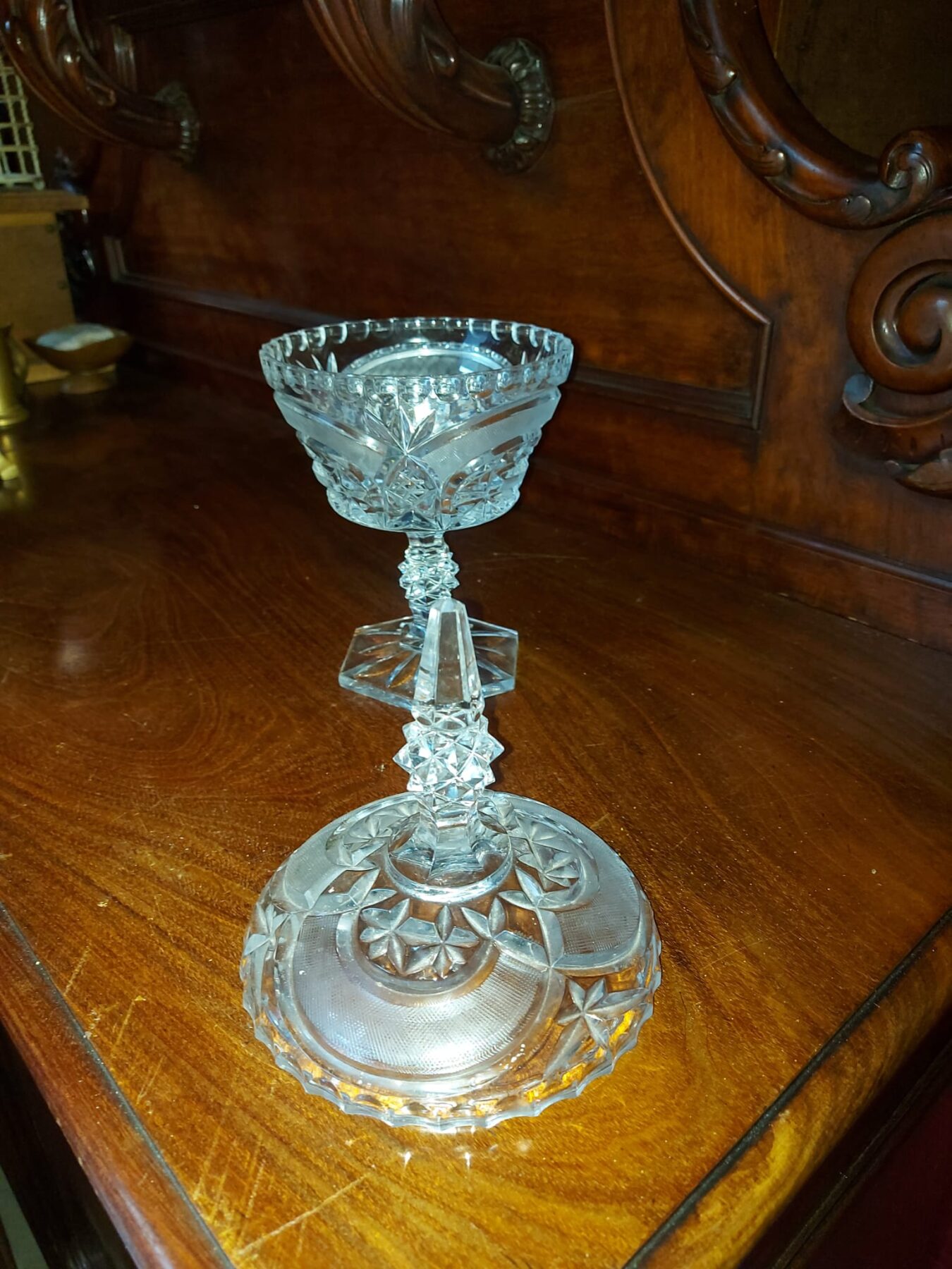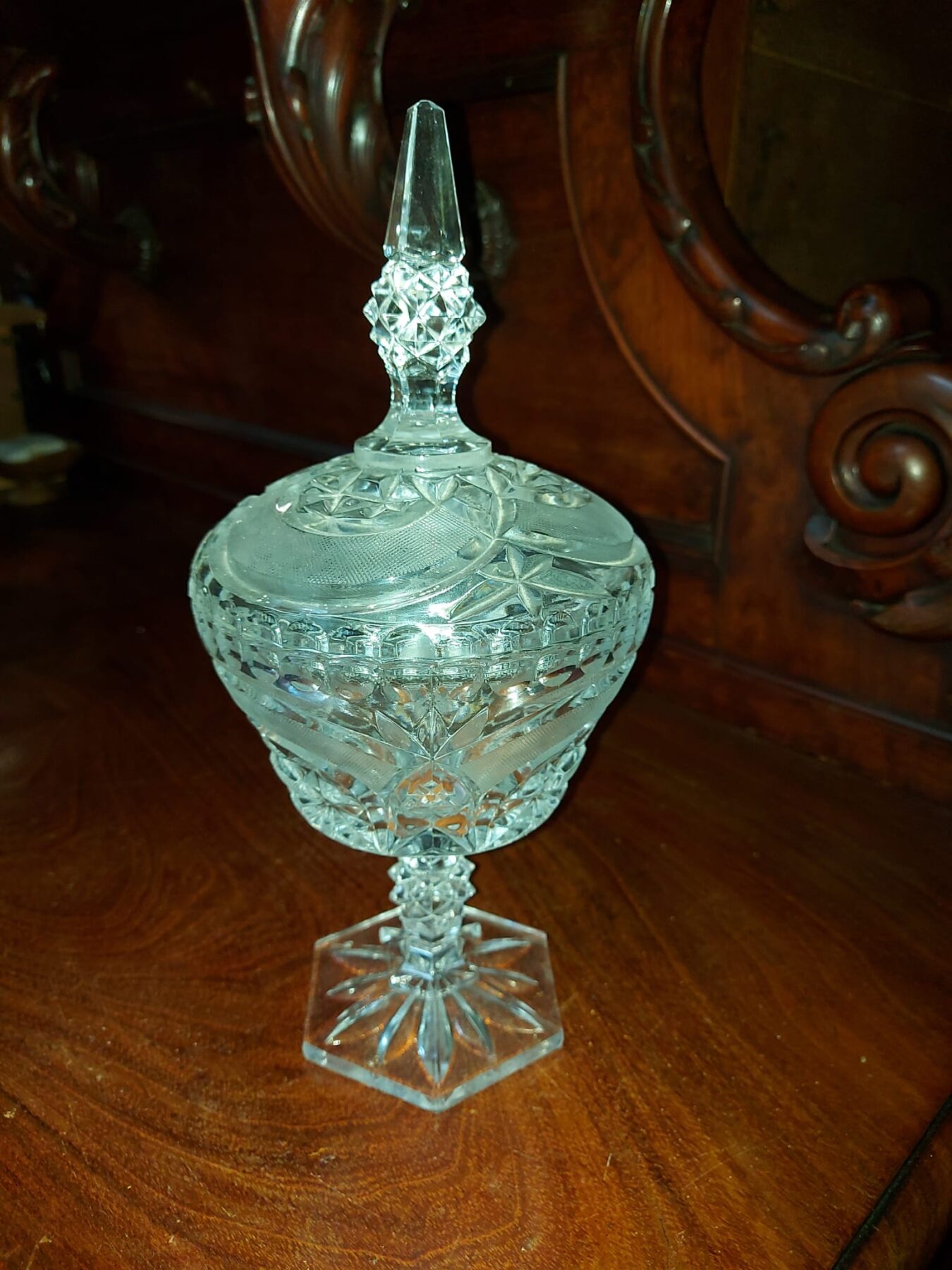 geperst kristallen object met een zeshoekige voet en puntige knop op het deksel.