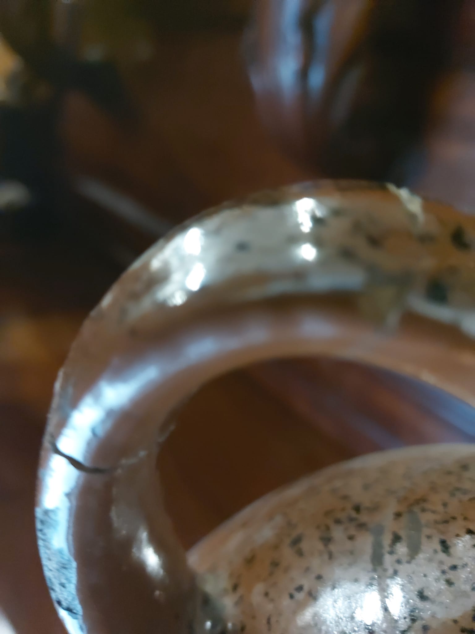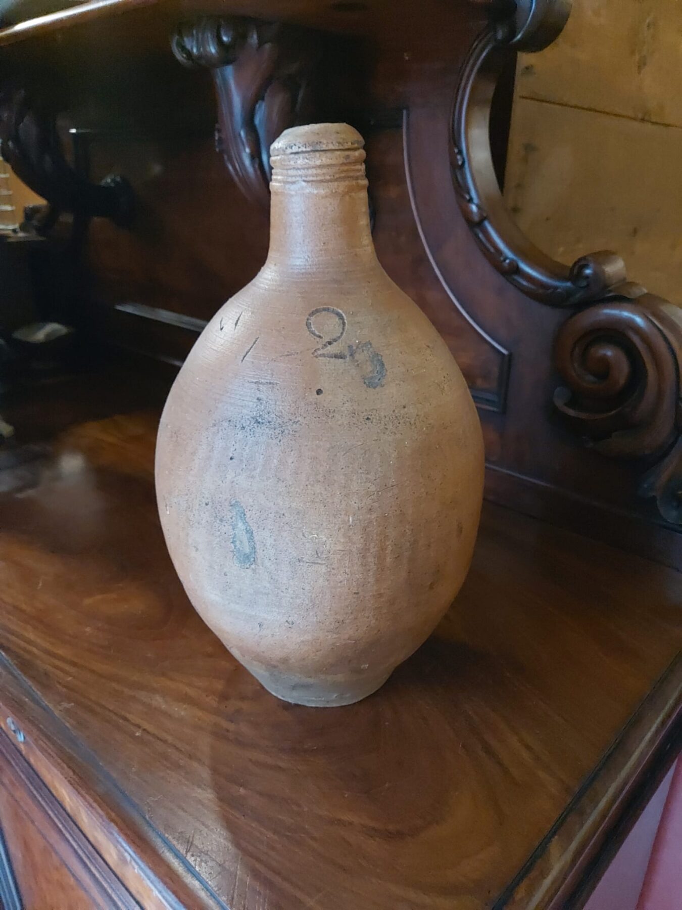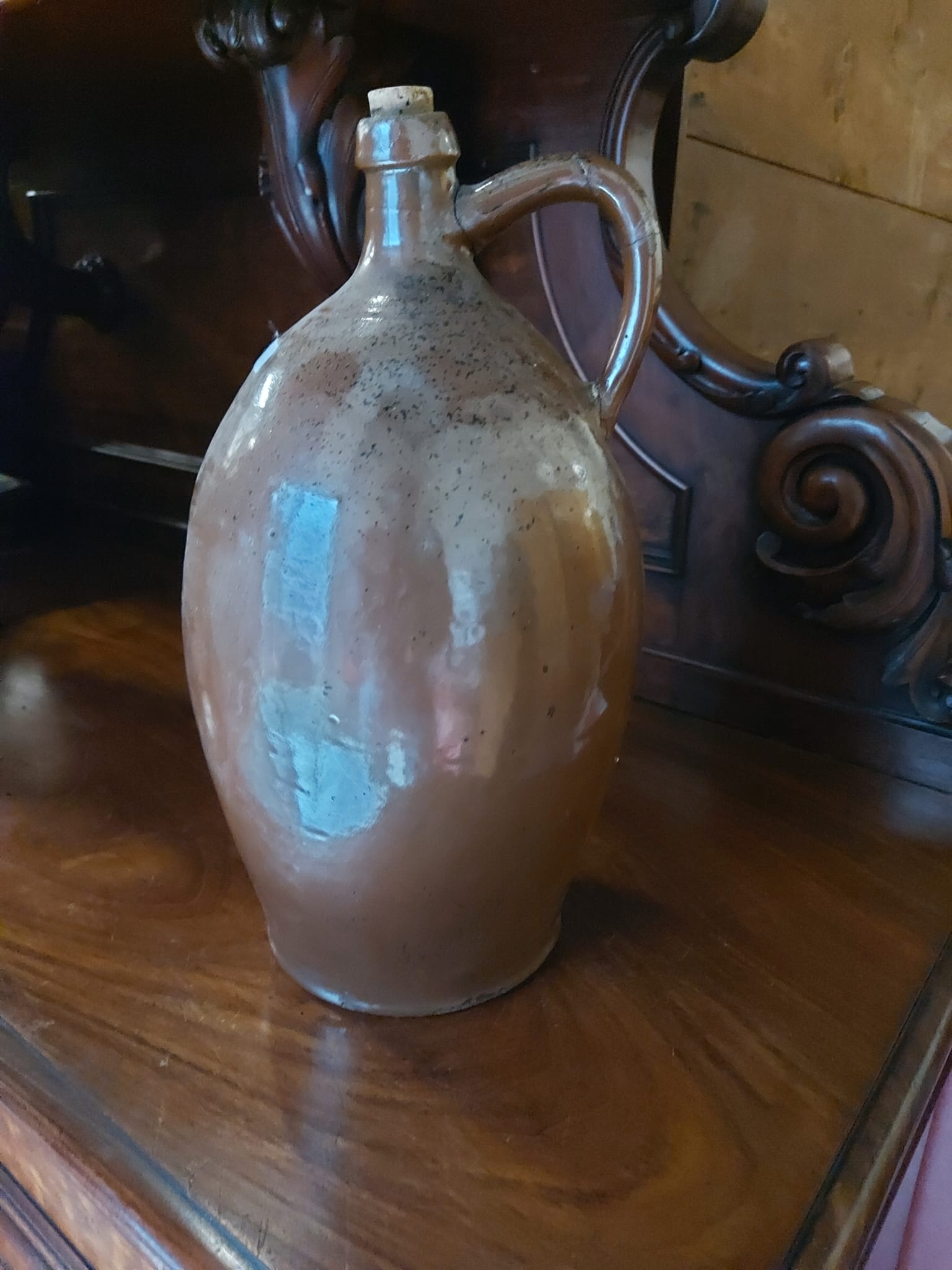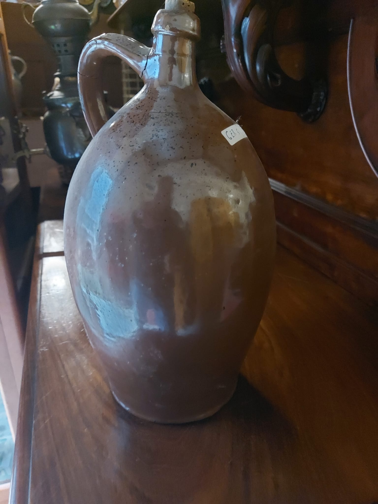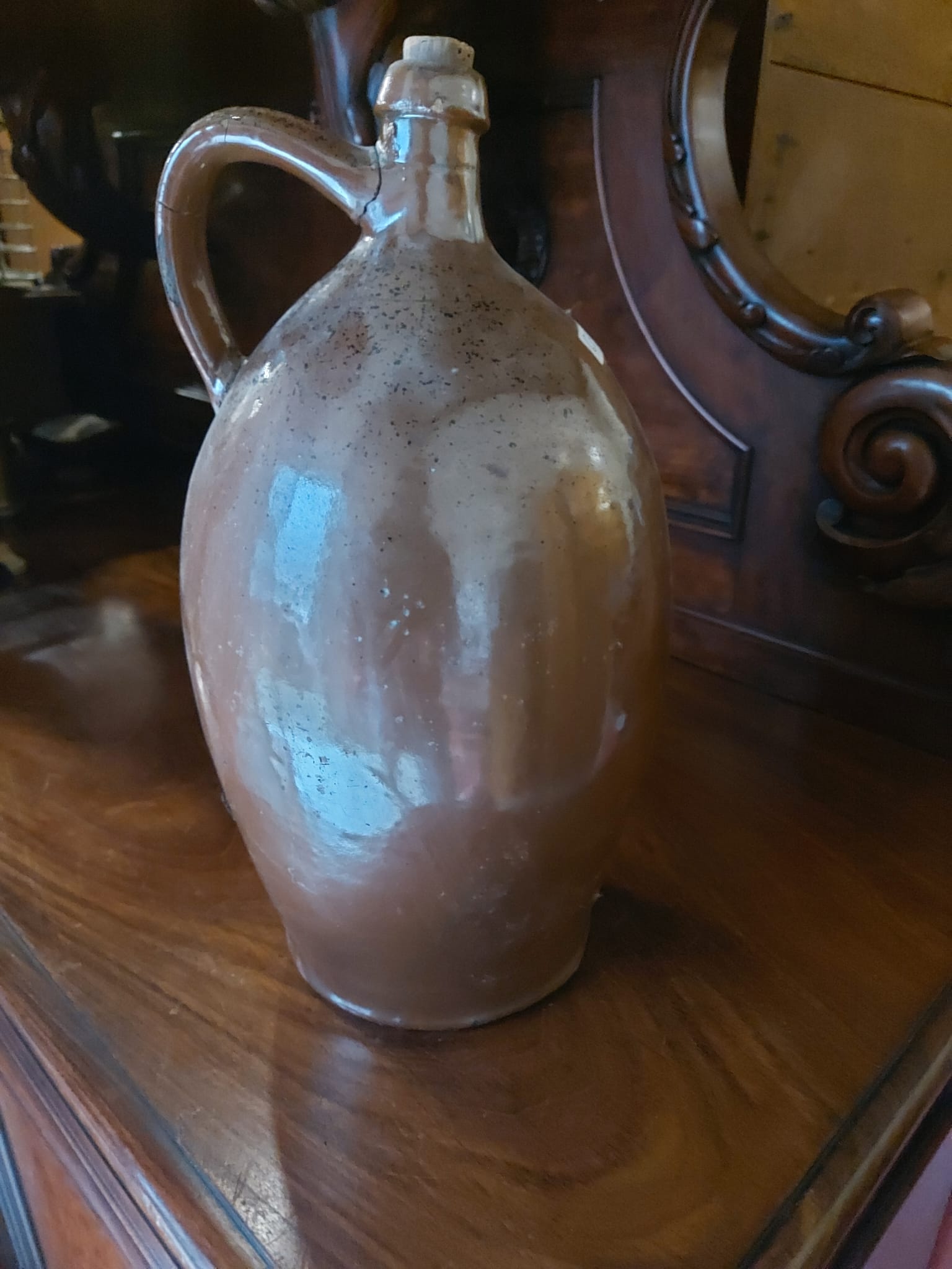 Oude zoutgeglazuurde aardewerken kruik met restauratie aan het oor (zie foto’s).
