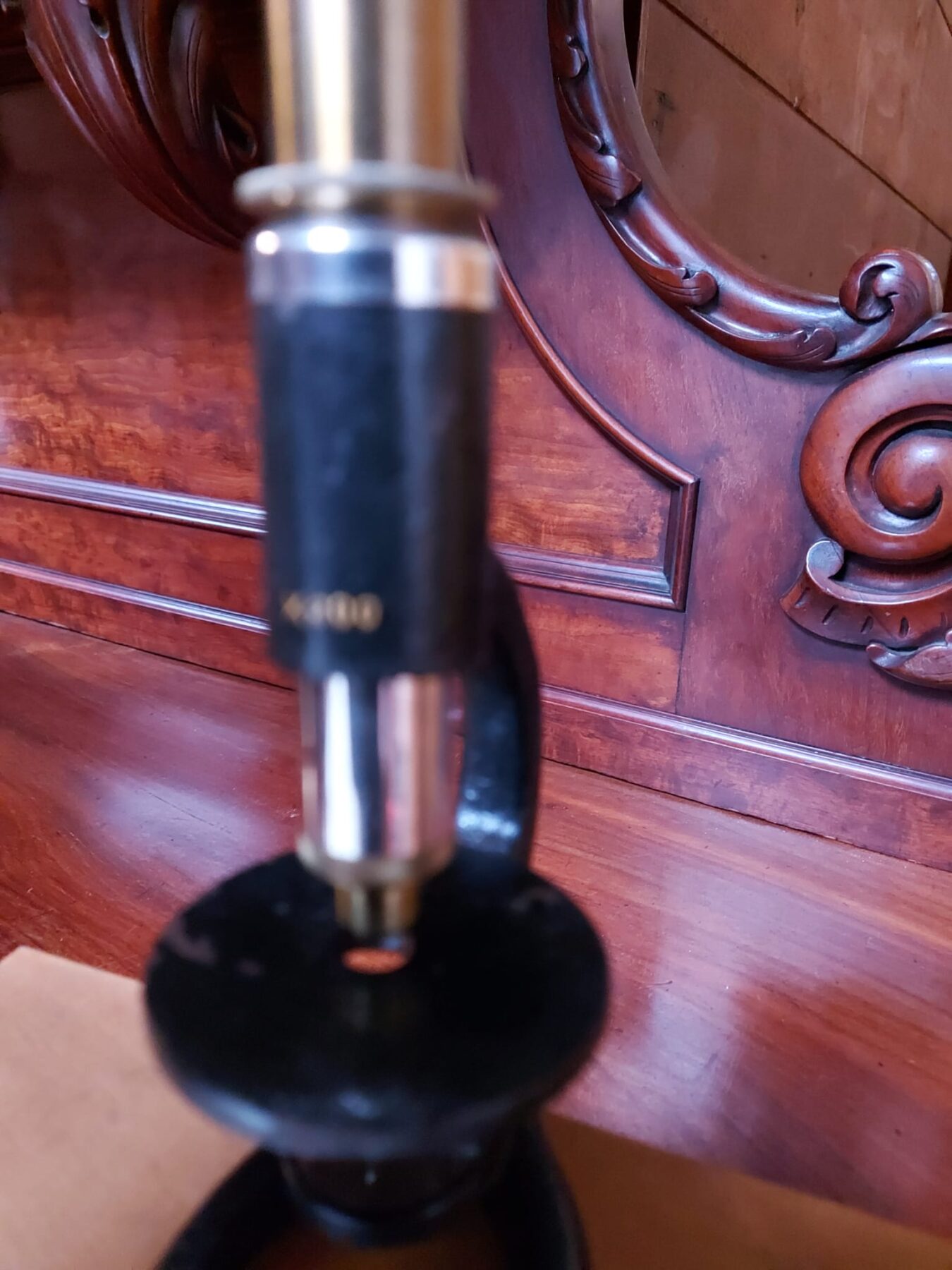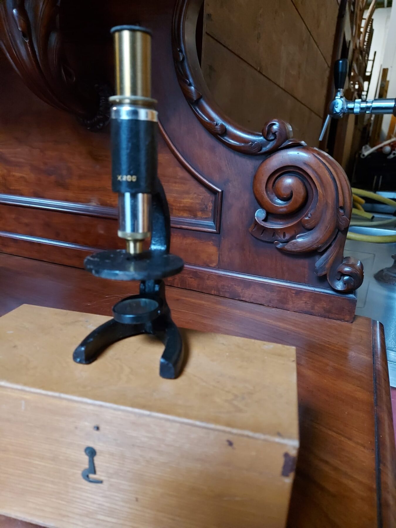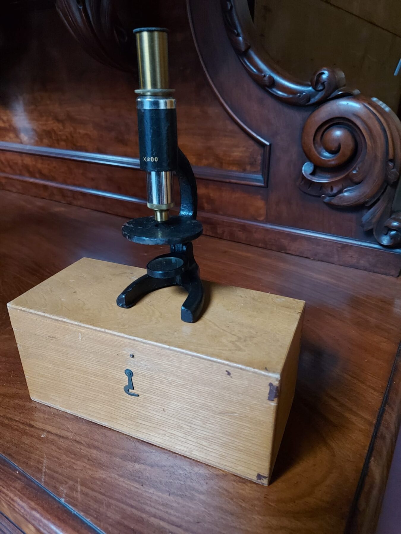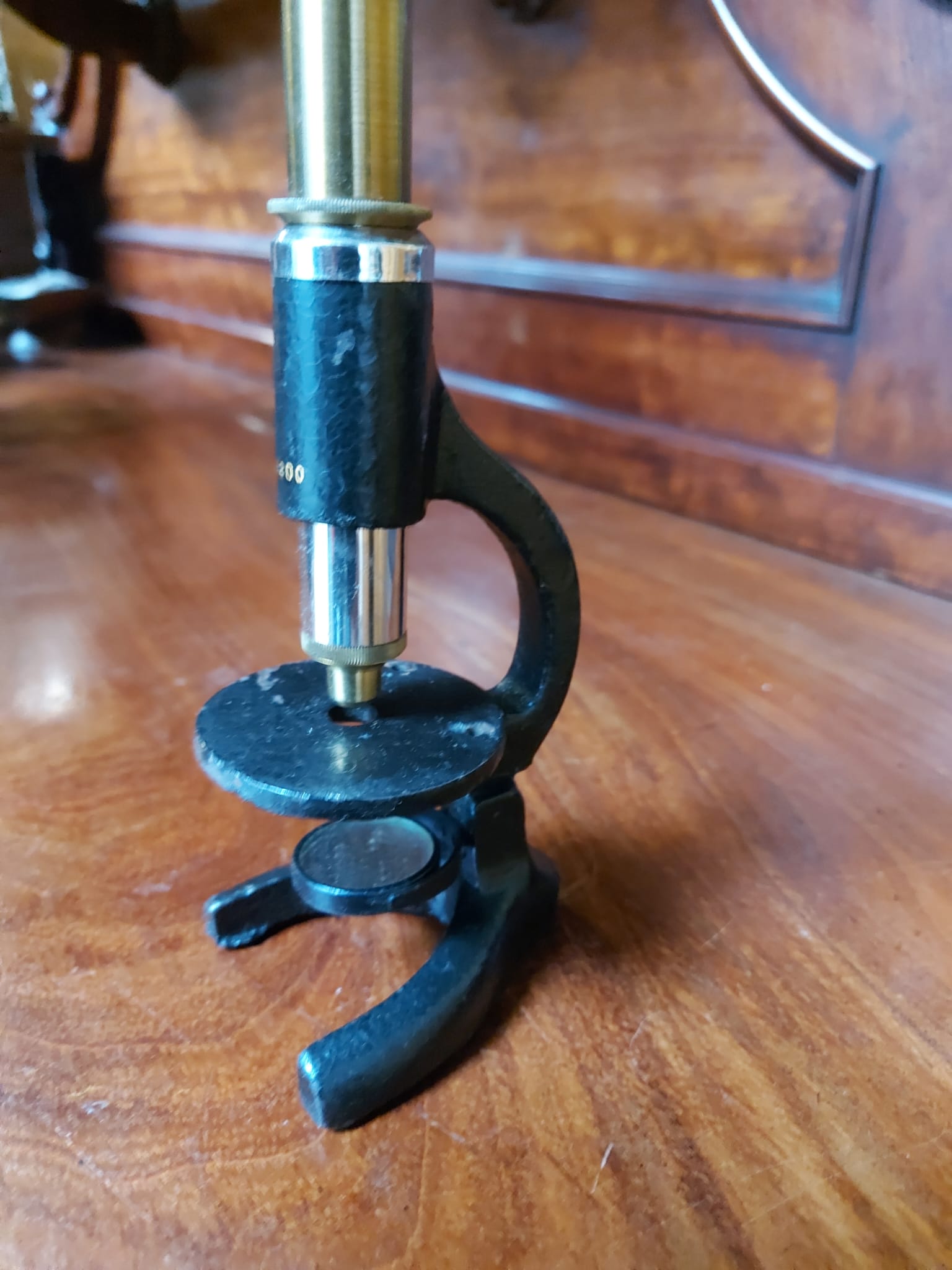 primitieve zakmicroscoop met aan de voorzijde de aanduiding x200