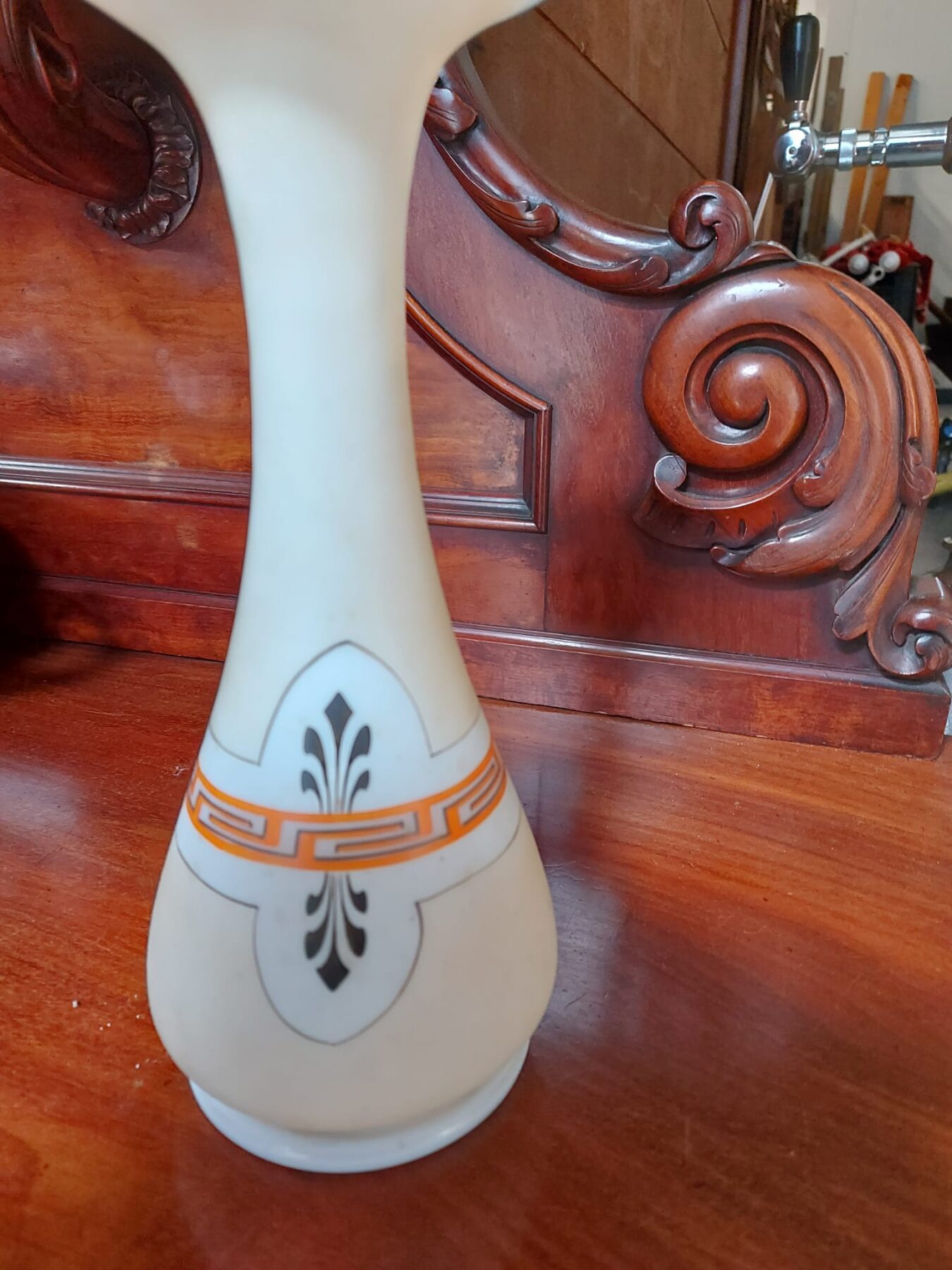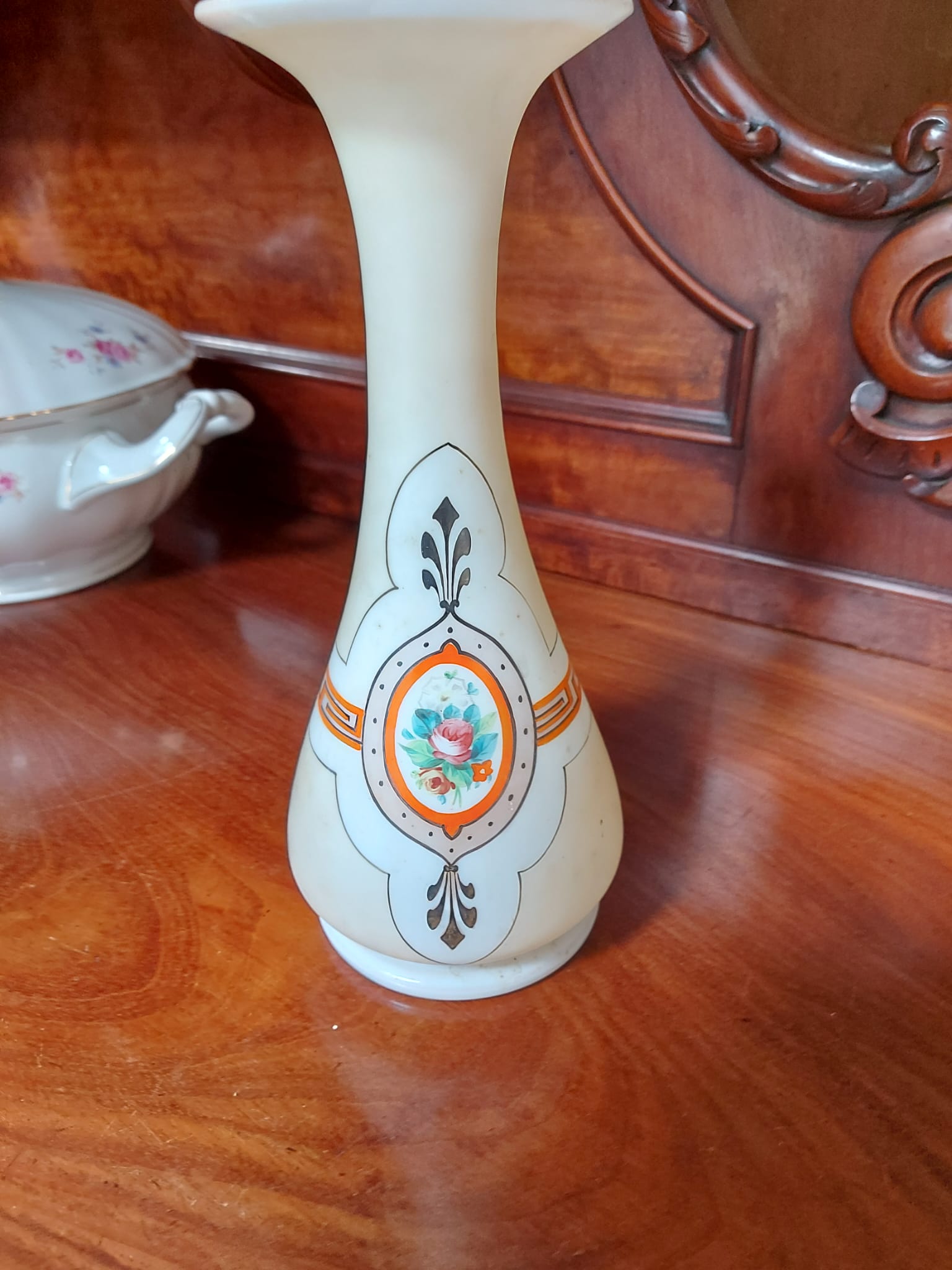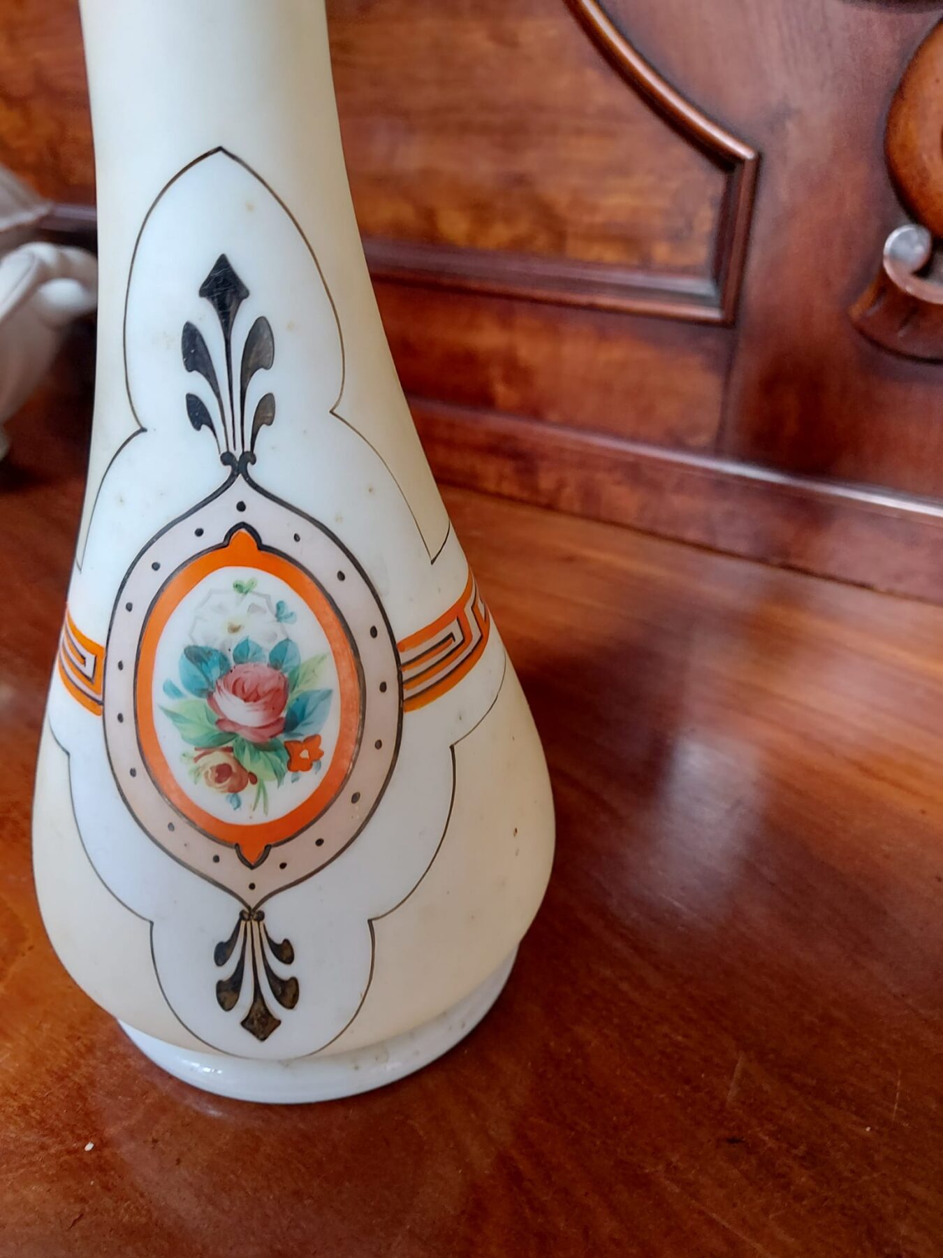 Opaline of melkglazen vaas met afbeelding met bloemen.