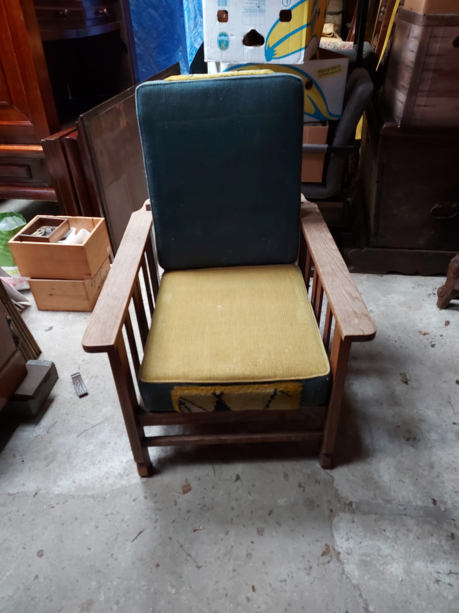 Rookstoel met verstelbare rugleuning en 2 kussens. De kussens zijn redelijk maar zouden opnieuw bekleed kunnen worden.