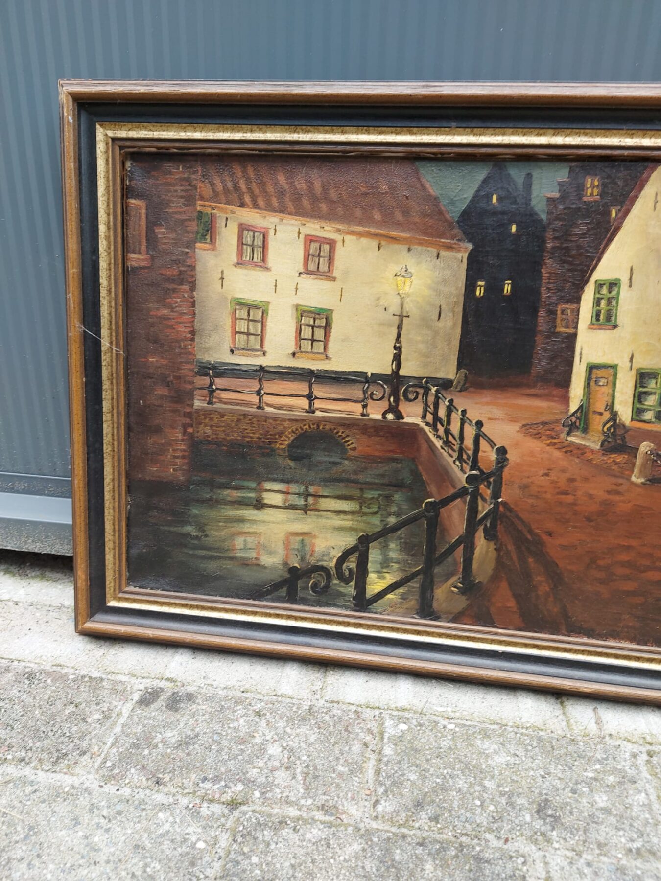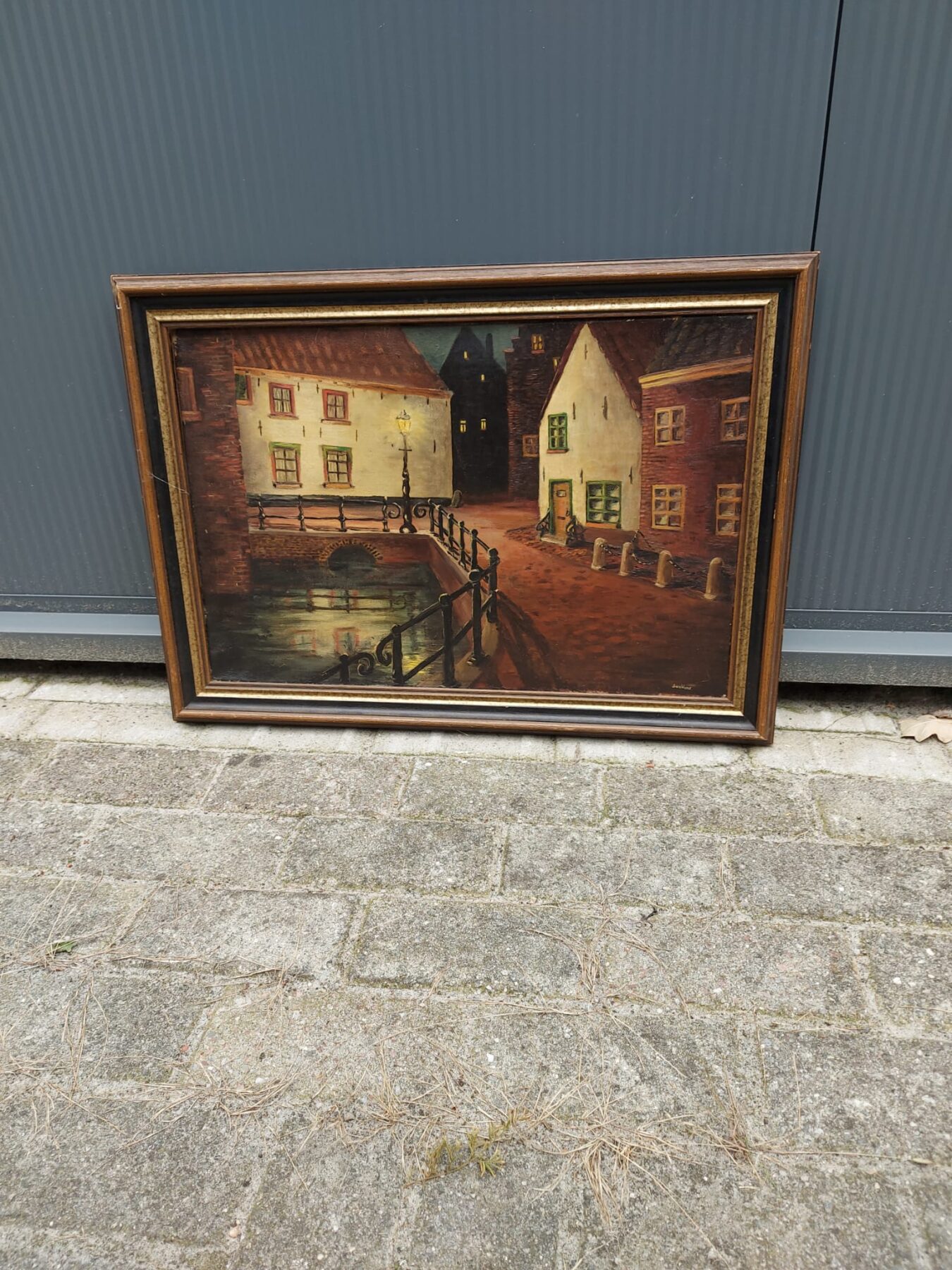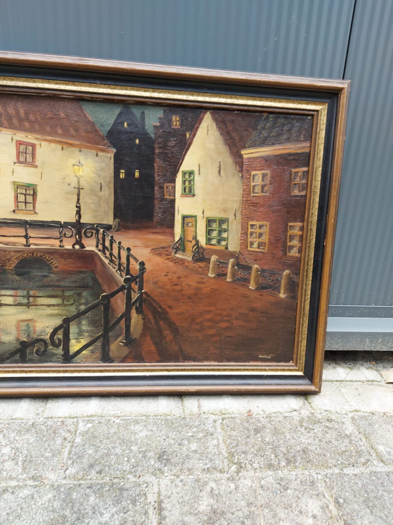 Schilderij met een stadsgezicht. Gesigneerd met JvdWerf