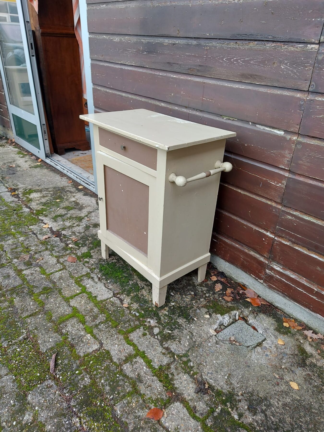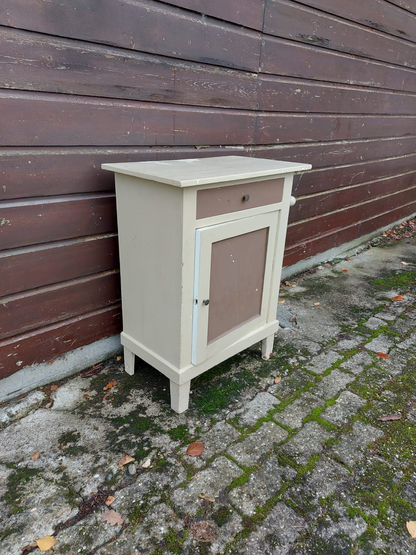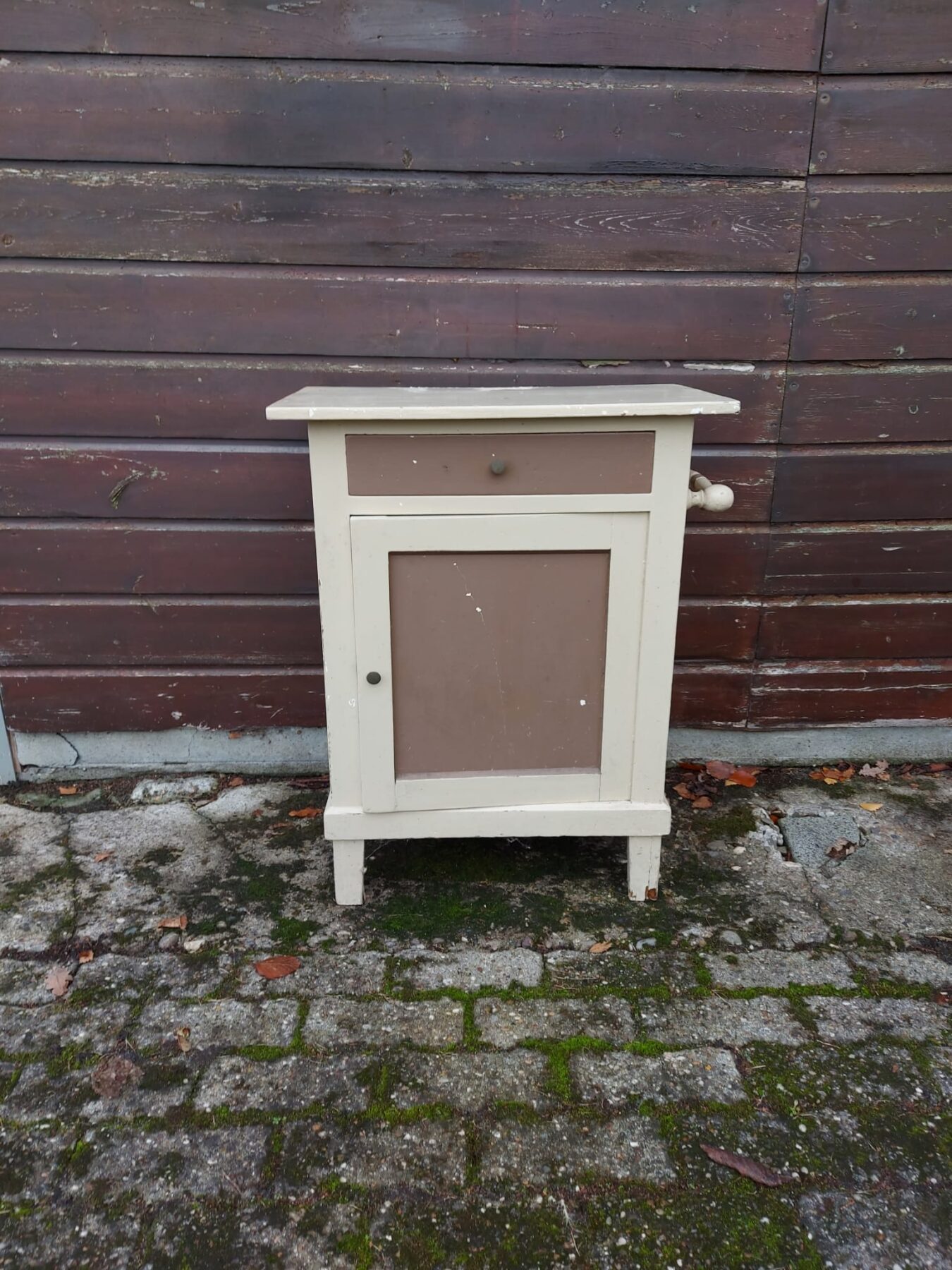 Vintage houten nachtkastje met lade en deur afgewerkt in bruin en wit.
