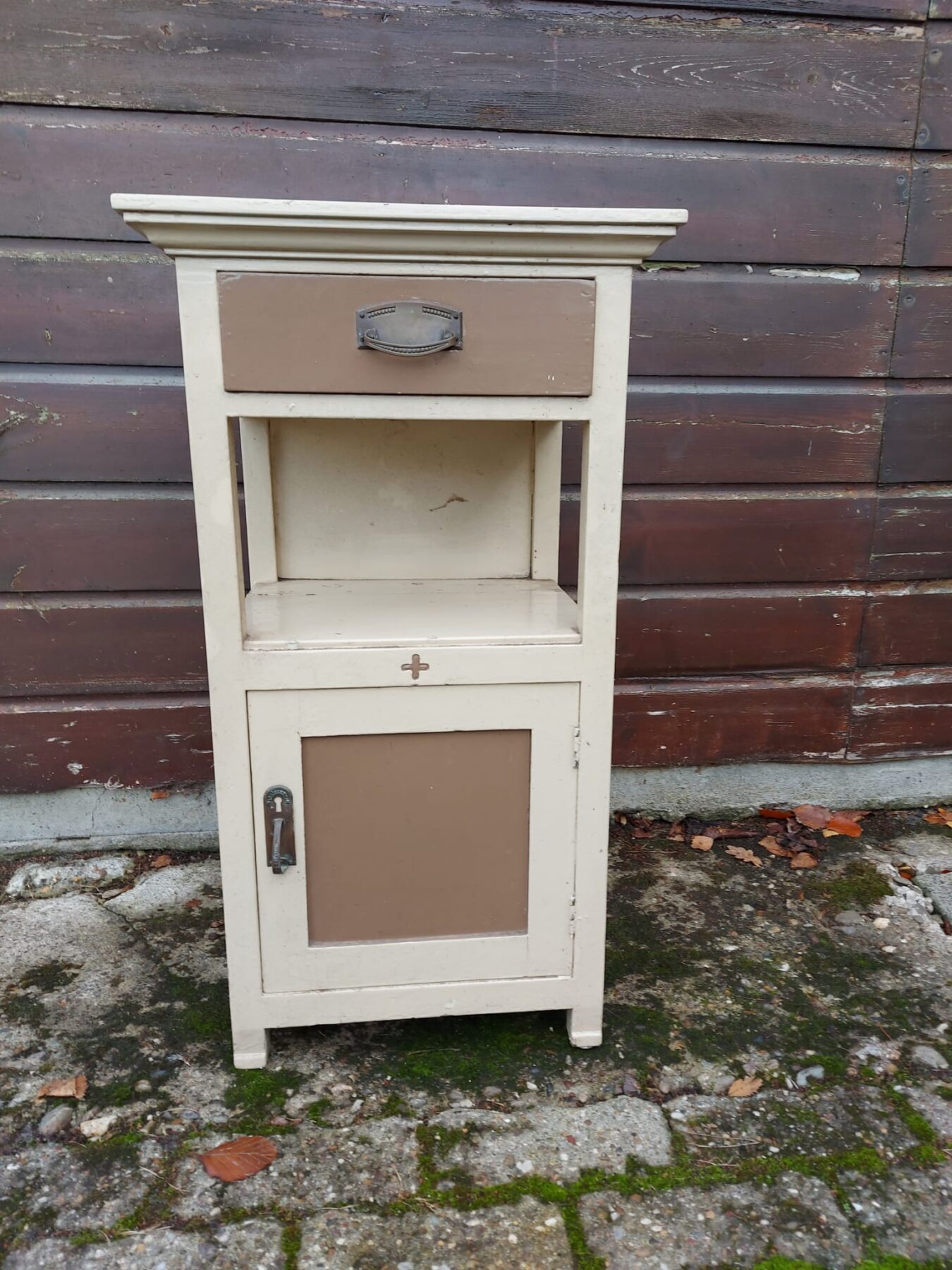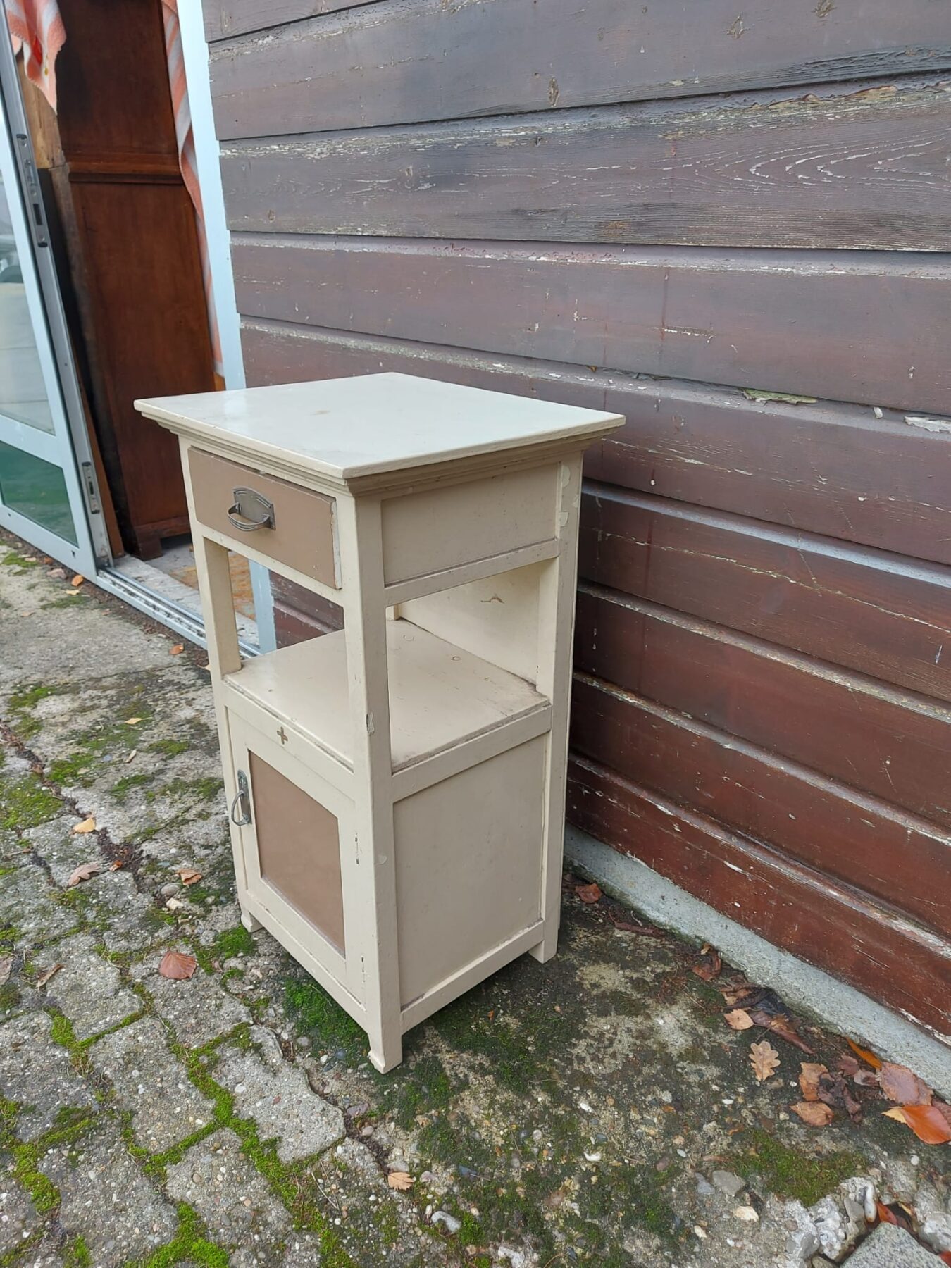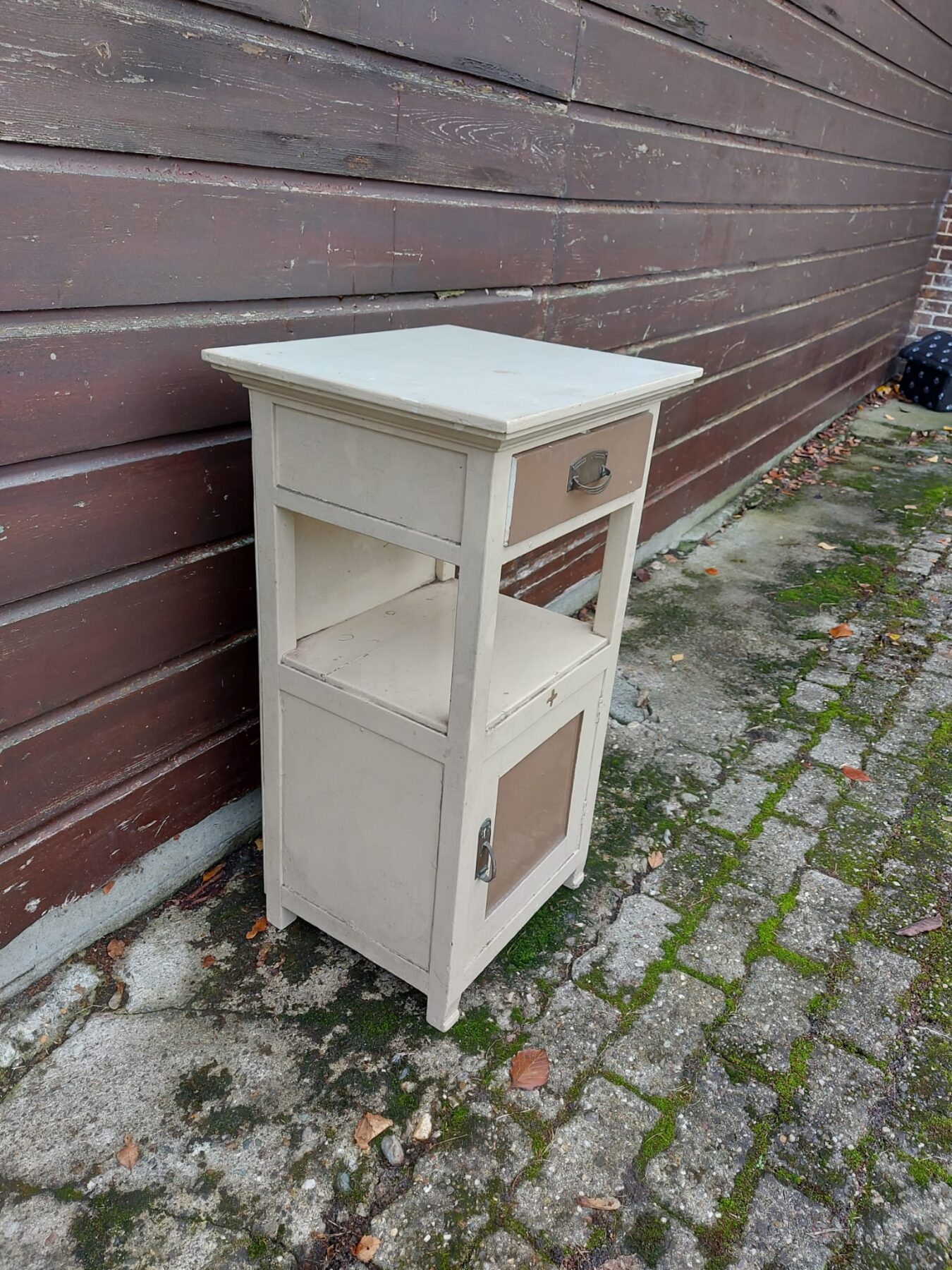 Vintage houten nachtkastje met lade, open schap en een kastje met deur afgewerkt in gebroken wit en bruin.